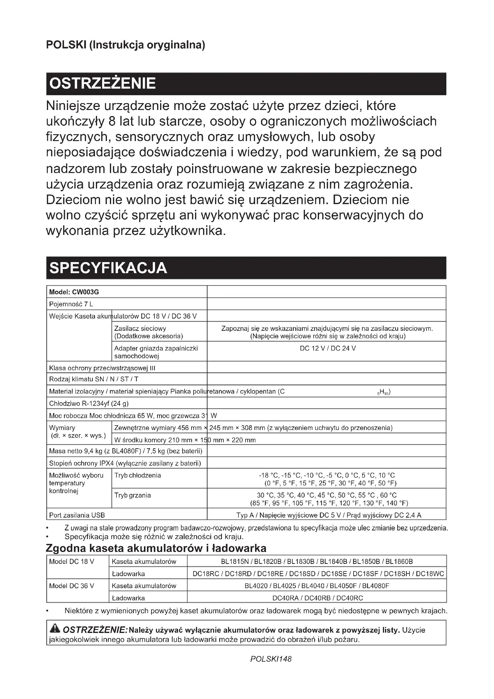 - Makita ehtne aku ja laadija MÄRKUS: Mõned loendis olevad üksused võivad standardvarustusena tööriistapaketti kuuluda. Need võivad riigiti erineda.POLSKI148 POLSKI (Instrukcja oryginalna) OSTRZEŻENIE Niniejsze urządzenie może zostać użyte przez dzieci, które ukończyły 8 lat lub starcze, osoby o ograniczonych możliwościach fizycznych, sensorycznych oraz umysłowych, lub osoby nieposiadające doświadczenia i wiedzy, pod warunkiem, że są pod nadzorem lub zostały poinstruowane w zakresie bezpiecznego użycia urządzenia oraz rozumieją związane z nim zagrożenia. Dzieciom nie wolno jest bawić się urządzeniem. Dzieciom nie wolno czyścić sprzętu ani wykonywać prac konserwacyjnych do wykonania przez użytkownika. SPECYFIKACJA Model: CW003GPojemność 7 LWejście Kaseta akumulatorów DC 18 V / DC 36 VZasilacz sieciowy (Dodatkowe akcesoria)Zapoznaj się ze wskazaniami znajdującymi się na zasilaczu sieciowym. (Napięcie wejściowe różni się w zależności od kraju)Adapter gniazda zapalniczki samochodowejDC 12 V / DC 24 VKlasa ochrony przeciwstrząsowej IIIRodzaj klimatu SN / N / ST / TMateriał izolacyjny / materiał spieniający Pianka poliuretanowa / cyklopentan (C
