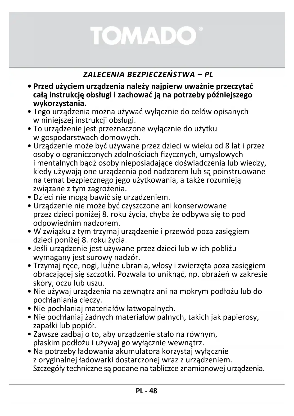 - Korzystaniezakcesoriów,któreniesązalecanelubsprzedawane przezrmęTomado,możedoprowadzićdopożaru,porażenia prądemlubobrażeńciała.