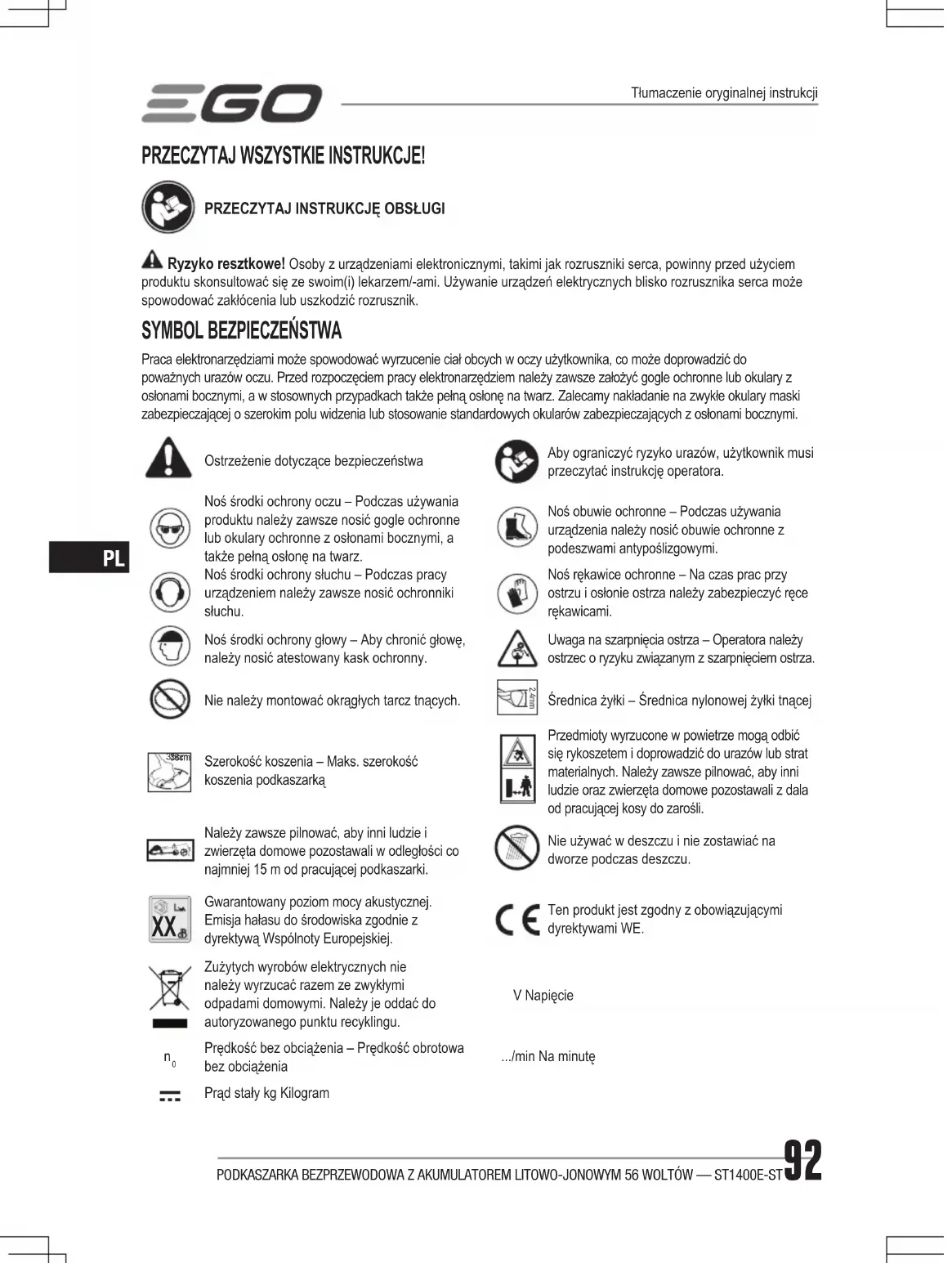 Prędkość bez obciążenia – Prędkość obrotowa bez obciążenia.../min Na minutęPrąd stały kg KilogramTłumaczenie oryginalnej instrukcjiPODKASZARKA BEZPRZEWODOWA Z AKUMULATOREM LITOWO-JONOWYM 56 WOLTÓW — ST1400E-ST 93