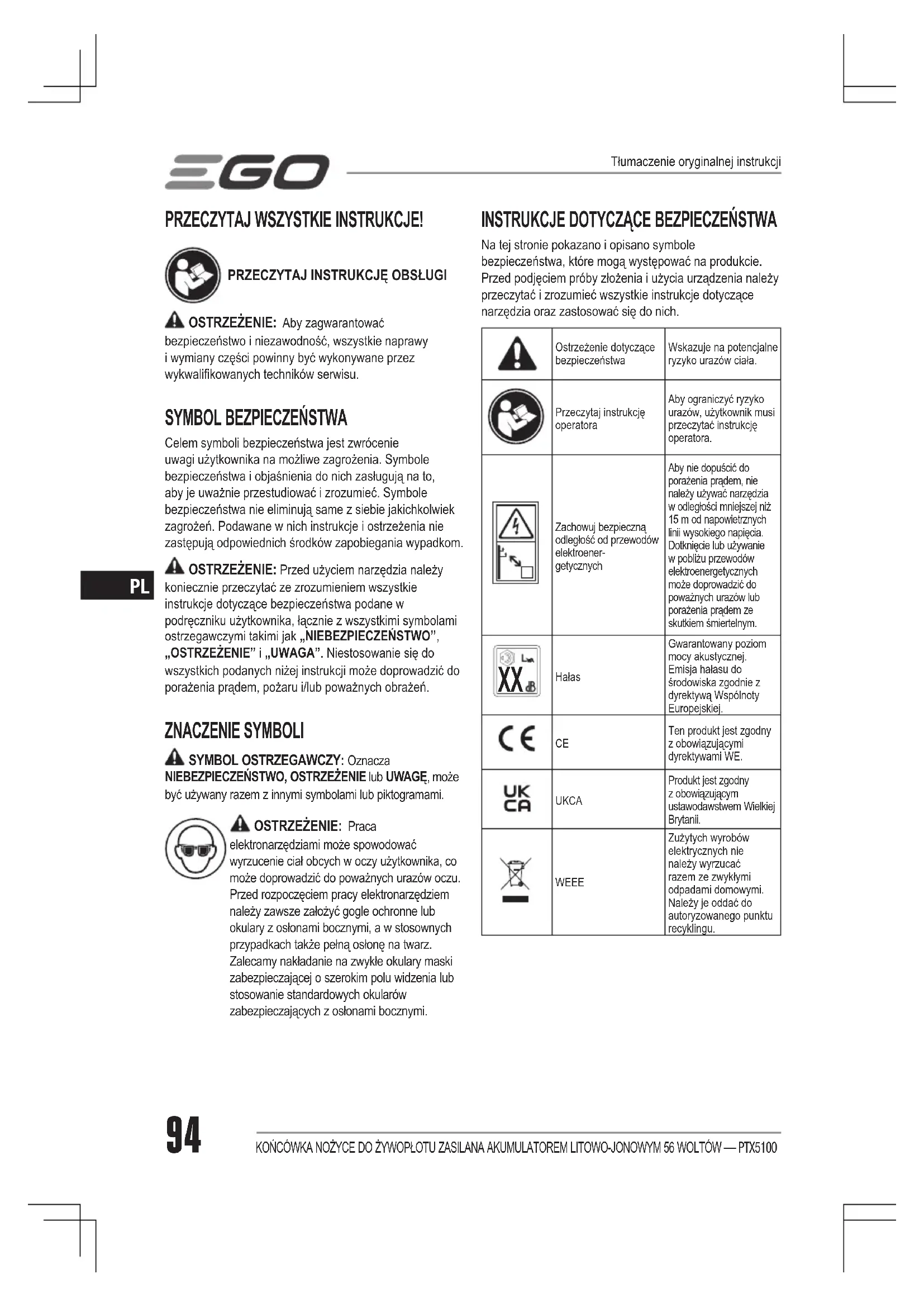 W celu zapoznania się z wszystkimi warunkami polityki gwarancyjnej EGO prosimy odwiedzić stronę egopowerplus.eu.102