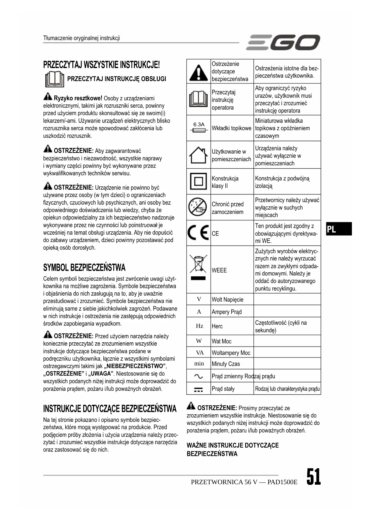 PAD1500E - Bateria EGO - Bezpłatna instrukcja obsługi