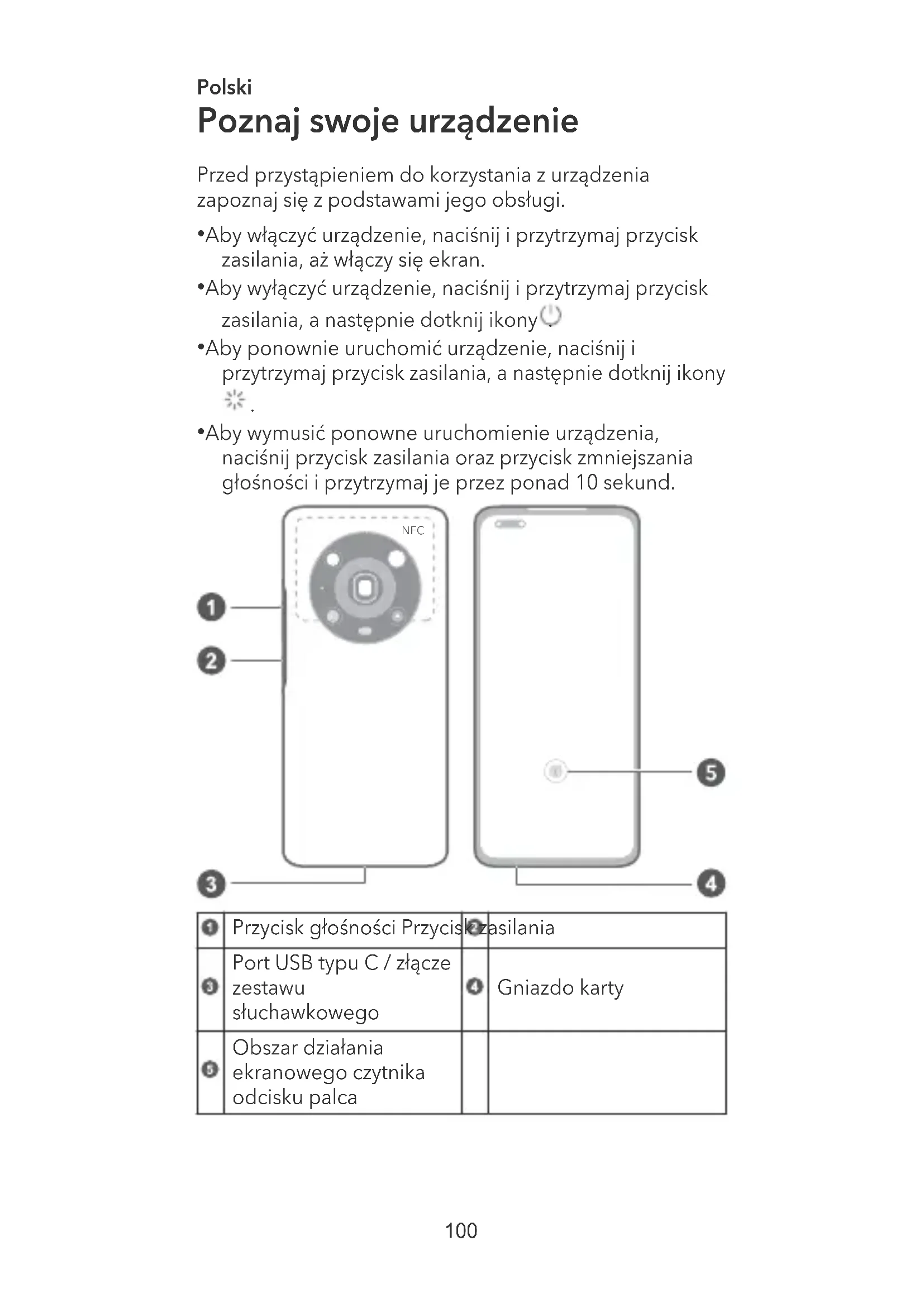 - Aby wymusić ponowne uruchomienie urządzenia, naciśnij przycisk zasilania oraz przycisk zmniejszania głośności i przytrzymaj je przez ponad 10 sekund. NFC Przycisk głośności Przycisk zasilania Port USB typu C / złącze zestawu słuchawkowego Gniazdo karty Obszar działania ekranowego czytnika odcisku palca 100• Podczas korzystania z tej funkcji obszar aktywny NFC należy jak najbardziej zbliżyć do drugiego urządzenia lub przedmiotu.