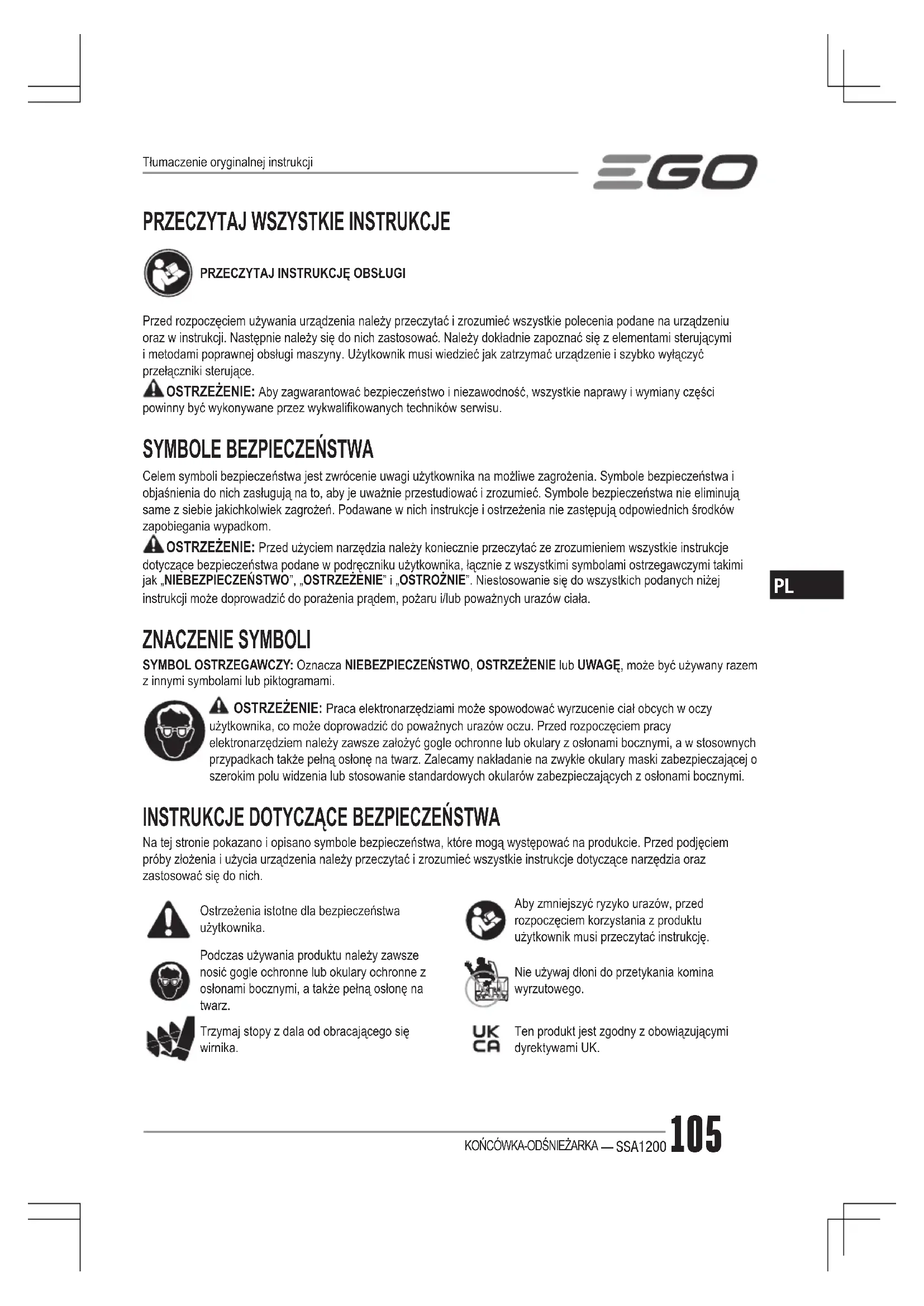 Na tej stronie pokazano i opisano symbole bezpieczeństwa, które mogą występować na produkcie. Przed podjęciem próby złożenia i użycia urządzenia należy przeczytać i zrozumieć wszystkie instrukcje dotyczące narzędzia oraz zastosować się do nich.Ostrzeżenia istotne dla bezpieczeństwa użytkownika.Aby zmniejszyć ryzyko urazów, przed rozpoczęciem korzystania z produktu użytkownik musi przeczytać instrukcję.Podczas używania produktu należy zawsze nosić gogle ochronne lub okulary ochronne z osłonami bocznymi, a także pełną osłonę na twarz.Nie używaj dłoni do przetykania komina wyrzutowego.Trzymaj stopy z dala od obracającego się wirnika.Ten produkt jest zgodny z obowiązującymi dyrektywami UK.Tłumaczenie oryginalnej instrukcjiKOŃCÓWKA-ODŚNIEŻARKA — SSA1200106