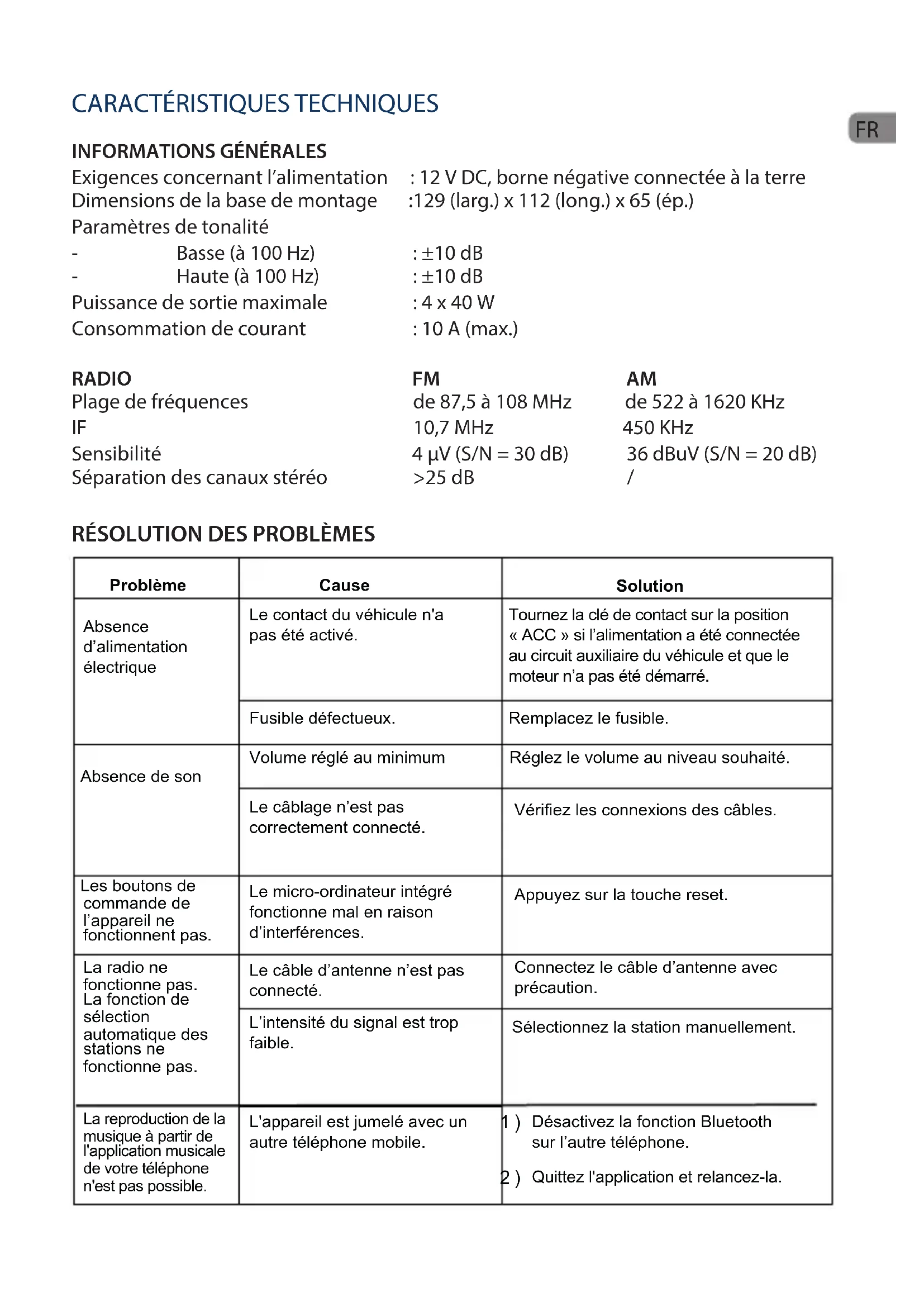 Wymagania dotyczące zasilania : Prąd stały o napięciu 12 V, zacisk ujemny połączony z masą Wymiary podstawy montażowej : 129 (szer.) x 112 (gł.) x 65 (wys.) Ustawienia tonów - Niskie (przy 100 Hz) : ±10 dB - Wysokie (przy 100 Hz) : ±10 dB Maksymalna moc wyjściowa : 4 × 40 W Pobór prądu : 10 A (maks.)
