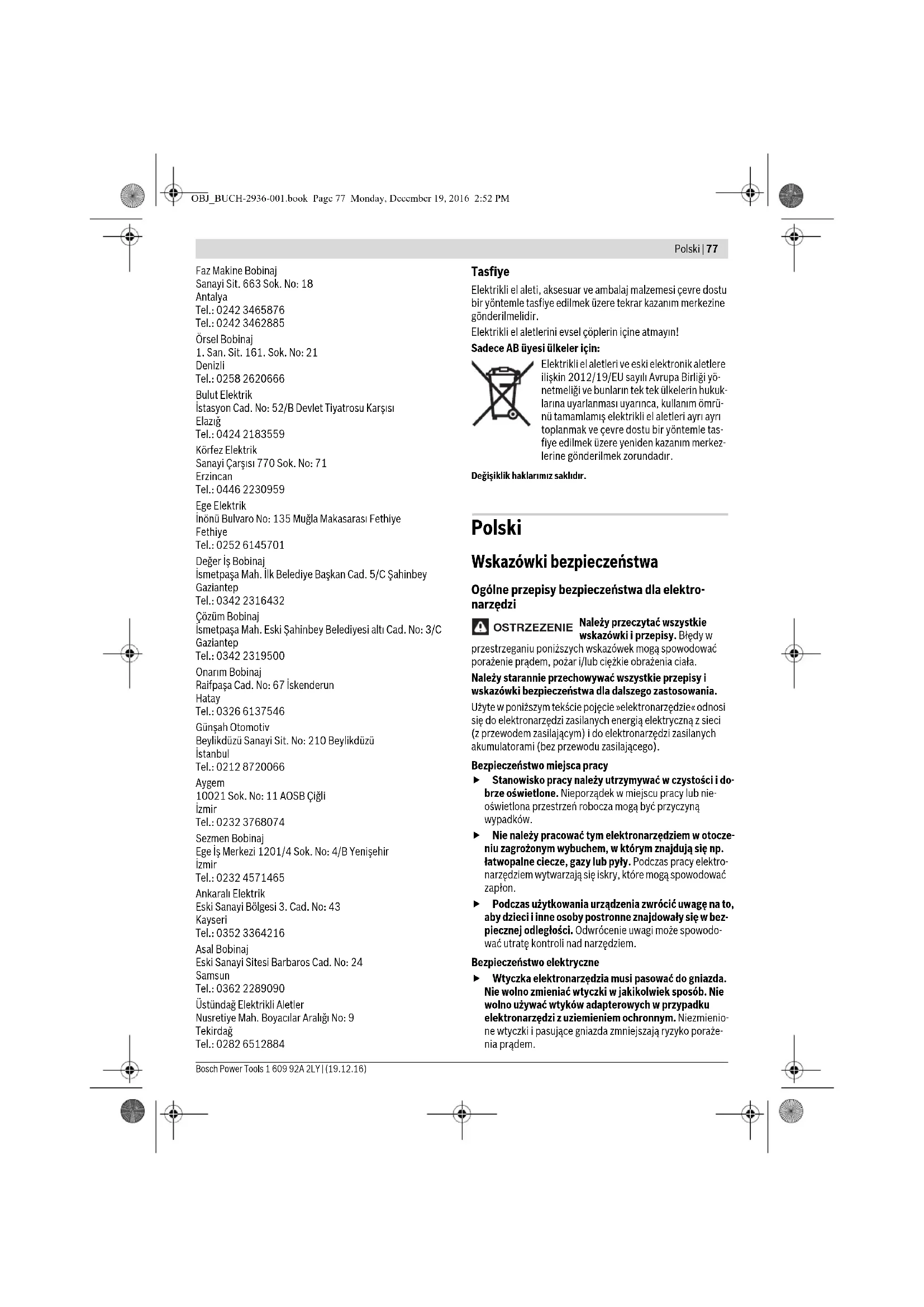 Denizli Tel.: 0258 2620666 Bulut Elektrik İstasyon Cad. No: 52/B Devlet Tiyatrosu Karşısı Elazığ Tel.: 0424 2183559 Körfez Elektrik Sanayi Çarşısı 770 Sok. No: 71 Erzincan Tel.: 0446 2230959 Ege Elektrik İnönü Bulvaro No: 135 Muğla Makasarası Fethiye Fethiye Tel.: 0252 6145701 Değer İş Bobinaj İsmetpaşa Mah. İlk Belediye Başkan Cad. 5/C Şahinbey Gaziantep Tel.: 0342 2316432 Çözüm Bobinaj İsmetpaşa Mah. Eski Şahinbey Belediyesi altı Cad. No: 3/C Gaziantep Tel.: 0342 2319500 Onarım Bobinaj Raifpaşa Cad. No: 67 İskenderun Hatay Tel.: 0326 6137546 Günşah Otomotiv Beylikdüzü Sanayi Sit. No: 210 Beylikdüzü İstanbul Tel.: 0212 8720066 Aygem 10021 Sok. No: 11 AOSB Çiğli İzmir Tel.: 0232 3768074 Sezmen Bobinaj Ege İş Merkezi 1201/4 Sok. No: 4/B Yenişehir İzmir Tel.: 0232 4571465 Ankaralı Elektrik Eski Sanayi Bölgesi 3. Cad. No: 43 Kayseri Tel.: 0352 3364216 Asal Bobinaj Eski Sanayi Sitesi Barbaros Cad. No: 24 Samsun Tel.: 0362 2289090 Üstündağ Elektrikli Aletler Nusretiye Mah. Boyacılar Aralığı No: 9 Tekirdağ Tel.: 0282 6512884 Tasfiye Elektrikli el aleti, aksesuar ve ambalaj malzemesi çevre dostu bir yöntemle tasfiye edilmek üzere tekrar kazanım merkezine gönderilmelidir. Elektrikli el aletlerini evsel çöplerin içine atmayın! Sadece AB üyesi ülkeler için: Elektrikli el aletleri ve eski elektronik aletlere ilişkin 2012/19/EU sayılı Avrupa Birliği yö- netmeliği ve bunların tek tek ülkelerin hukuk- larına uyarlanması uyarınca, kullanım ömrü- nü tamamlamış elektrikli el aletleri ayrı ayrı toplanmak ve çevre dostu bir yöntemle tas- fiye edilmek üzere yeniden kazanım merkez- lerine gönderilmek zorundadır. Değişiklik haklarımız saklıdır. Polski Wskazówki bezpieczeństwa Ogólne przepisy bezpieczeństwa dla elektro- narzędzi Należy przeczytać wszystkie wskazówki i przepisy. Błędy w przestrzeganiu poniższych wskazówek mogą spowodować porażenie prądem, pożar i/lub ciężkie obrażenia ciała. Należy starannie przechowywać wszystkie przepisy i wskazówki bezpieczeństwa dla dalszego zastosowania. Użyte w poniższym tekście pojęcie »elektronarzędzie« odnosi się do elektronarzędzi zasilanych energią elektryczną z sieci (z przewodem zasilającym) i do elektronarzędzi zasilanych akumulatorami (bez przewodu zasilającego). Bezpieczeństwo miejsca pracy Stanowisko pracy należy utrzymywać w czystości i do- brze oświetlone. Nieporządek w miejscu pracy lub nie- oświetlona przestrzeń robocza mogą być przyczyną wypadków. Nie należy pracować tym elektronarzędziem w otocze- niu zagrożonym wybuchem, w którym znajdują się np. łatwopalne ciecze, gazy lub pyły. Podczas pracy elektro- narzędziem wytwarzają się iskry, które mogą spowodować zapłon. Podczas użytkowania urządzenia zwrócić uwagę na to, aby dzieci i inne osoby postronne znajdowały się w bez- piecznej odległości. Odwrócenie uwagi może spowodo- wać utratę kontroli nad narzędziem. Bezpieczeństwo elektryczne Wtyczka elektronarzędzia musi pasować do gniazda. Nie wolno zmieniać wtyczki w jakikolwiek sposób. Nie wolno używać wtyków adapterowych w przypadku elektronarzędzi z uziemieniem ochronnym. Niezmienio- ne wtyczki i pasujące gniazda zmniejszają ryzyko poraże- nia prądem. OSTRZEZENIE OBJ_BUCH-2936-001.book Page 77 Monday, December 19, 2016 2:52 PM78 | Polski 1 609 92A 2LY | (19.12.16) Bosch Power Tools Należy unikać kontaktu z uziemionymi powierzchniami jak rury, grzejniki, piece i lodówki. Ryzyko porażenia prądem jest większe, gdy ciało użytkownika jest uziemio- ne. Urządzenie należy zabezpieczyć przed deszczem i wil- gocią. Przedostanie się wody do elektronarzędzia pod- wyższa ryzyko porażenia prądem. Nigdy nie należy używać przewodu do innych czynno- ści. Nigdy nie należy nosić elektronarzędzia, trzymając je za przewód, ani używać przewodu do zawieszenia urządzenia; nie wolno też wyciągać wtyczki z gniazdka pociągając za przewód. Przewód należy chronić przed wysokimi temperaturami, należy go trzymać z dala od oleju, ostrych krawędzi lub ruchomych części urządze- nia. Uszkodzone lub splątane przewody zwiększają ryzyko porażenia prądem. W przypadku pracy elektronarzędziem pod gołym nie- bem, należy używać przewodu przedłużającego, dosto- sowanego również do zastosowań zewnętrznych. Uży- cie właściwego przedłużacza (dostosowanego do pracy na zewnątrz) zmniejsza ryzyko porażenia prądem. Jeżeli nie da się uniknąć zastosowania elektronarzę- dzia w wilgotnym otoczeniu, należy użyć wyłącznika ochronnego różnicowo-prądowego. Zastosowanie wyłącznika ochronnego różnicowo-prądowego zmniejsza ryzyko porażenia prądem. Bezpieczeństwo osób Podczas pracy z elektronarzędziem należy zachować ostrożność, każdą czynność wykonywać uważnie i z rozwagą. Nie należy używać elektronarzędzia, gdy jest się zmęczonym lub będąc pod wpływem narkotyków, alkoholu lub lekarstw. Moment nieuwagi przy użyciu elektronarzędzia może stać się przyczyną poważnych ura- zów ciała. Należy nosić osobiste wyposażenie ochronne i zawsze okulary ochronne. Noszenie osobistego wyposażenia ochronnego – maski przeciwpyłowej, obuwia z podeszwa- mi przeciwpoślizgowymi, kasku ochronnego lub środków ochrony słuchu (w zależności od rodzaju i zastosowania elektronarzędzia) – zmniejsza ryzyko obrażeń ciała. Należy unikać niezamierzonego uruchomienia narzę- dzia. Przed włożeniem wtyczki do gniazdka i/lub podłą- czeniem do akumulatora, a także przed podniesieniem lub przeniesieniem elektronarzędzia, należy upewnić się, że elektronarzędzie jest wyłączone. Trzymanie pal- ca na wyłączniku podczas przenoszenia elektronarzędzia lub podłączenie do prądu włączonego narzędzia, może stać się przyczyną wypadków. Przed włączeniem elektronarzędzia, należy usunąć na- rzędzia nastawcze
