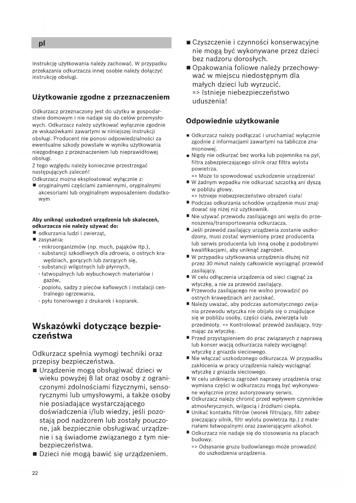 Instrukcję użytkowania należy zachować. W przypadku przekazania odkurzacza innej osobie należy dołączyć instrukcję obsługi. Użytkowanie zgodne z przeznaczeniem Odkurzacz przeznaczony jest do użytku w gospodar- stwie domowym i nie nadaje się do celów przemysło- wych. Odkurzacz należy użytkować wyłącznie zgodnie ze wskazówkami zawartymi w niniejszej instrukcji