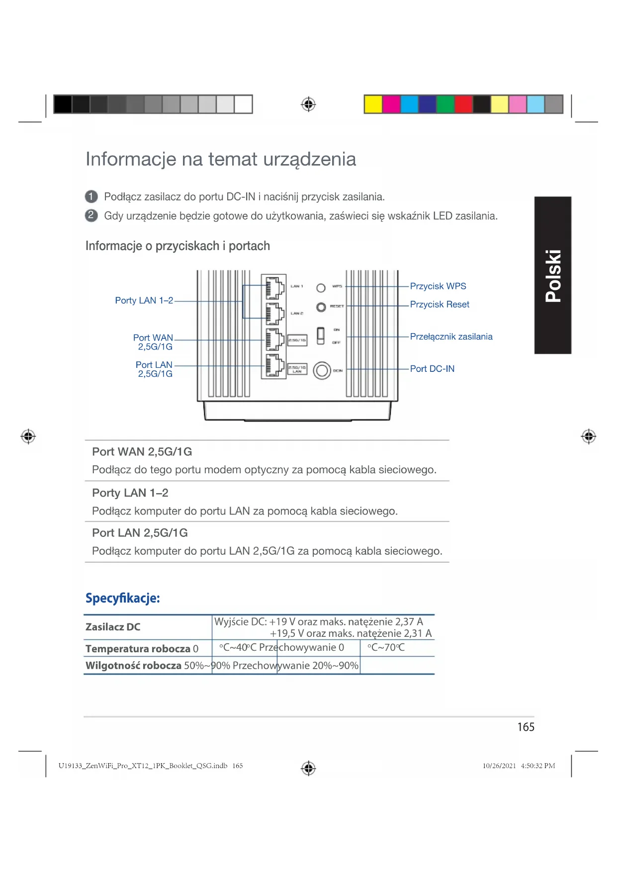 Wilgotność robocza 50%~90% Przechowywanie 20%~90% Specykacje: Port LAN 2,5G/1GPrzycisk WPSPrzycisk ResetPrzełącznik zasilania U19133_ZenWiFi_Pro_XT12_1PK_Booklet_QSG.indb 165U19133_ZenWiFi_Pro_XT12_1PK_Booklet_QSG.indb 165 10/26/2021 4:50:32 PM10/26/2021 4:50:32 PM166 Polski Przed Konfiguracją Przygotowanie do konfiguracji samodzielnego routera