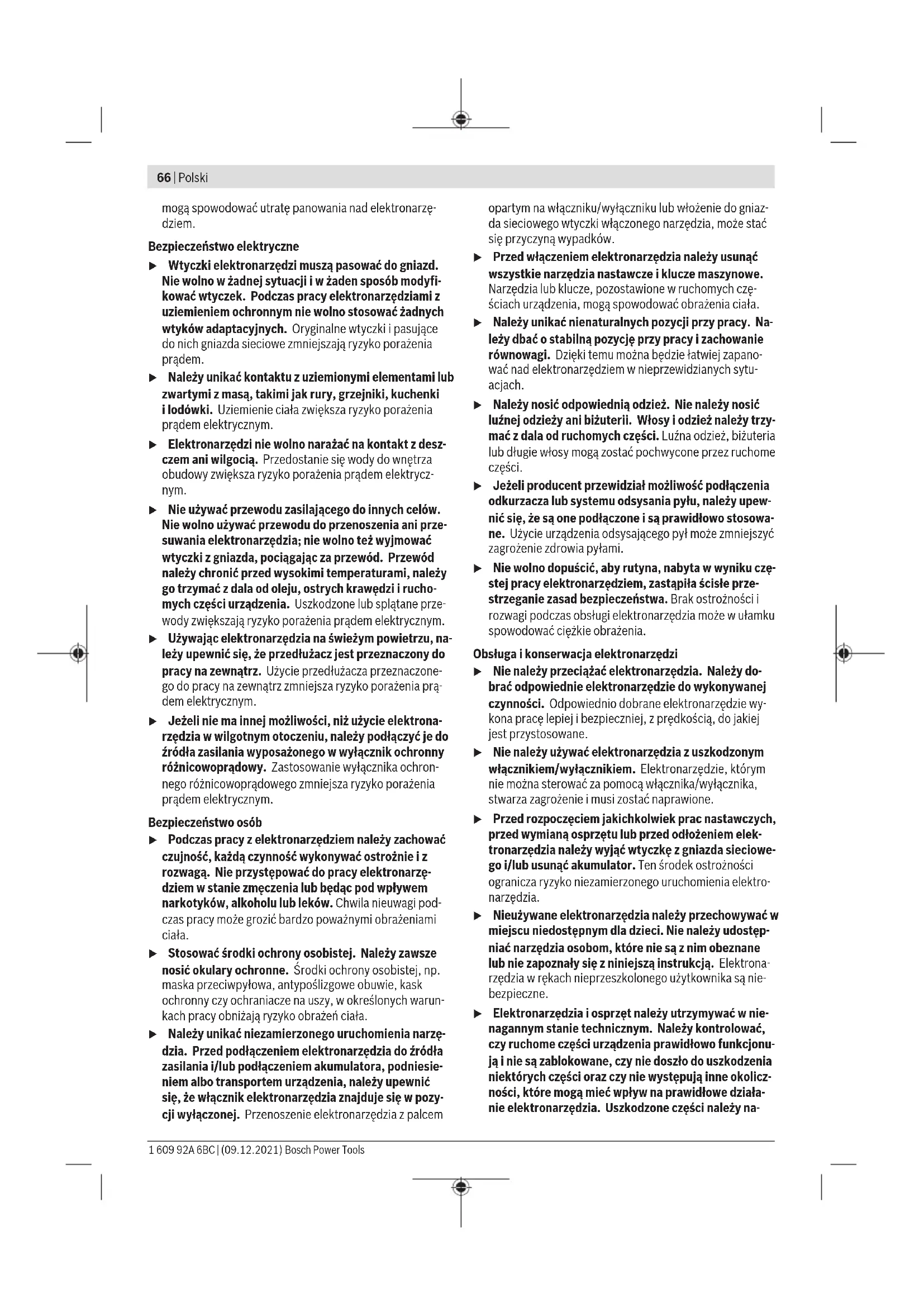 Karasoku Mahallesi 28028. Sokak No:20/A Merkez / ADANA Tel.: +903223599710 -3521379 Fax: +903223591323 E-mail: isiklar@isiklarelektrik.com Diğer servis adreslerini şurada bulabilirsiniz: www.bosch-pt.com/serviceaddresses Nakliye Önerilen Lityum İyon aküler tehlikeli madde taşıma yönetmeliği hükümlerine tabidir. Aküler başka bir yükümlülük olmaksızın kullanıcı tarafından caddeler üzerinde taşınabilir. Üçüncü kişiler eliyle yollanma durumunda (örneğin hava yolu ile veya nakliye şirketleri ile) paketleme ve etiketlemeye ilişkin özel hükümlere uyulmalıdır. Gönderi paketlenirken bir tehlikeli madde uzmanından yardım alınmalıdır. Aküleri sadece ve ancak gövdelerinde hasar yoksa gönderin. Açık kontakları kapatın ve aküyü ambalaj içinde hareket etmeyecek biçimde paketleyin. Lütfen olası ek ulusal yönetmelik hükümlerine de uyun. Tasfiye Hava pompaları, aküler, aksesuarlar ve ambalajlar çevre kurallarına uygun bir geri dönüşüm merkezine gönderilmelidir. Hava pompalarını ve aküleri/bataryaları evdeki çöplere atmayın! Sadece AB ülkeleri için: 2012/19/EU Avrupa yönetmeliği uyarınca kullanım ömrünü tamamlamış hava pompaları ve 2006/66/EC Avrupa yönetmeliği uyarınca arızalı veya kullanım ömrünü tamamlamış aküler/bataryalar, ayrı ayrı toplanmalı ve çevre kurallarına uygun şekilde imha edilmek üzere bir geri dönüşüm merkezine gönderilmelidir. Aküler/bataryalar: Lityum iyon: Lütfen nakliye bölümündeki talimata uyun (Bakınız „Nakliye“, Sayfa65) ile onaylama yapın. Polski Wskazówki bezpieczeństwa Ogólne wskazówki bezpieczeństwa dotyczące pracy z elektronarzędziami OSTRZEŻENIE Należy zapoznać się ze wszystkimi ostrzeżeniami i wskazówkami do- tyczącymi bezpieczeństwa użytkowania oraz ilustracjami i danymi technicznymi, dostarczonymi wraz z niniejszym elektronarzędziem. Nieprzestrzeganie poniższych wskazó- wek może stać się przyczyną porażenia prądem elektrycz- nym, pożaru i/lub poważnych obrażeń ciała. Należy zachować wszystkie przepisy i wskazówki bezpie- czeństwa dla dalszego zastosowania. Pojęcie "elektronarzędzie" odnosi się do elektronarzędzi za- silanych energią elektryczną z sieci (z przewodem zasilają- cym) i do elektronarzędzi zasilanych akumulatorami (bezprzewodu zasilającego). Bezpieczeństwo w miejscu pracy u Miejsce pracy należy utrzymywać w czystości i zapew- nić dobre oświetlenie. Nieporządek i brak właściwego oświetlenia sprzyjają wypadkom. u Elektronarzędzi nie należy używać w środowiskach za- grożonym wybuchem, np. w pobliżu łatwopalnych cie- czy, gazów lub pyłów. Podczas pracy elektronarzędziem wytwarzają się iskry, które mogą spowodować zapłon py- łów lub oparów. u Podczas użytkowania urządzenia należy zwrócić uwa- gę na to, aby dzieci i inne osoby postronne znajdowały się w bezpiecznej odległości. Czynniki rozpraszające Bosch Power Tools 1 609 92A 6BC | (09.12.2021)66 | Polski mogą spowodować utratę panowania nad elektronarzę- dziem. Bezpieczeństwo elektryczne u Wtyczki elektronarzędzi muszą pasować do gniazd. Nie wolno w żadnej sytuacji i w żaden sposób modyfi- kować wtyczek. Podczas pracy elektronarzędziami z uziemieniem ochronnym nie wolno stosować żadnych wtyków adaptacyjnych. Oryginalne wtyczki i pasujące do nich gniazda sieciowe zmniejszają ryzyko porażenia prądem. u Należy unikać kontaktu z uziemionymi elementami lub zwartymi z masą, takimi jak rury, grzejniki, kuchenki ilodówki. Uziemienie ciała zwiększa ryzyko porażenia prądem elektrycznym. u Elektronarzędzi nie wolno narażać na kontakt z desz- czem ani wilgocią. Przedostanie się wody do wnętrza obudowy zwiększa ryzyko porażenia prądem elektrycz- nym. u Nie używać przewodu zasilającego do innych celów. Nie wolno używać przewodu do przenoszenia ani prze- suwania elektronarzędzia; nie wolno też wyjmować wtyczki z gniazda, pociągając za przewód. Przewód należy chronić przed wysokimi temperaturami, należy go trzymać zdala od oleju, ostrych krawędzi i rucho- mych części urządzenia. Uszkodzone lub splątane prze- wody zwiększają ryzyko porażenia prądem elektrycznym. u Używając elektronarzędzia na świeżym powietrzu, na- leży upewnić się, że przedłużacz jest przeznaczony do pracy na zewnątrz. Użycie przedłużacza przeznaczone- go do pracy na zewnątrz zmniejsza ryzyko porażenia prą- dem elektrycznym. u Jeżeli nie ma innej możliwości, niż użycie elektrona- rzędzia w wilgotnym otoczeniu, należy podłączyć je do źródła zasilania wyposażonego w wyłącznik ochronny różnicowoprądowy. Zastosowanie wyłącznika ochron- nego różnicowoprądowego zmniejsza ryzyko porażenia prądem elektrycznym. Bezpieczeństwo osób u Podczas pracy z elektronarzędziem należy zachować czujność, każdą czynność wykonywać ostrożnie i z rozwagą. Nie przystępować do pracy elektronarzę- dziem w stanie zmęczenia lub będąc pod wpływem narkotyków, alkoholu lub leków. Chwila nieuwagi pod- czas pracy może grozić bardzo poważnymi obrażeniami ciała. u Stosować środki ochrony osobistej. Należy zawsze nosić okulary ochronne. Środki ochrony osobistej, np. maska przeciwpyłowa, antypoślizgowe obuwie, kask ochronny czy ochraniacze na uszy, w określonych warun- kach pracy obniżają ryzyko obrażeń ciała. u Należy unikać niezamierzonego uruchomienia narzę- dzia. Przed podłączeniem elektronarzędzia do źródła zasilania i/lub podłączeniem akumulatora, podniesie- niem albo transportem urządzenia, należy upewnić się, że włącznik elektronarzędzia znajduje się w pozy- cji wyłączonej. Przenoszenie elektronarzędzia z palcem opartym na włączniku/wyłączniku lub włożenie do gniaz- da sieciowego wtyczki włączonego narzędzia, może stać się przyczyną wypadków. u Przed włączeniem elektronarzędzia należy usunąć wszystkie n