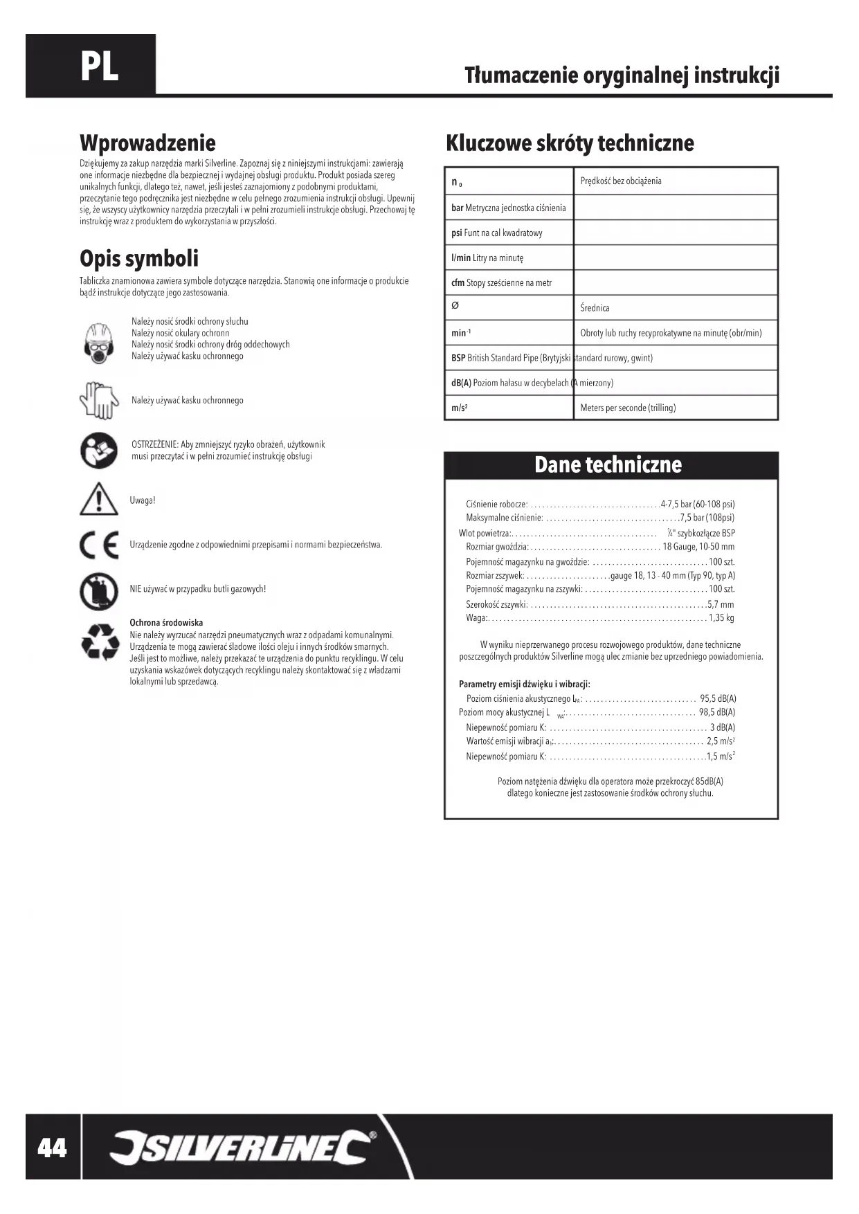 Ciśnienierobocze: ..................................4-7,5 bar (60-108 psi) Maksymalneciśnienie: ...................................7,5 bar (108psi) Wlot powietrza:...................................... ⁄4"szybkozłączeBSP Rozmiargwoździa: .................................. 18 Gauge, 10-50 mm Pojemnośćmagazynkunagwoździe: ..............................100 szt. Rozmiar zszywek: ......................gauge 18, 13 - 40 mm (Typ 90, typ A) Pojemnośćmagazynkunazszywki: ................................100 szt. Szerokośćzszywki: ..............................................5,7 mm Waga:.........................................................1,35 kg W wyniku nieprzerwanego procesu rozwojowego produktów, dane techniczne poszczególnychproduktówSilverlinemogąuleczmianiebezuprzedniegopowiadomienia. Parametry emisji dźwięku i wibracji: PoziomciśnieniaakustycznegoL : ............................. 95,5 dB(A) Poziom mocy akustycznej L :.................................. 98,5 dB(A) NiepewnośćpomiaruK: .........................................3 dB(A) Wartośćemisjiwibracjia :....................................... 2,5 m/s