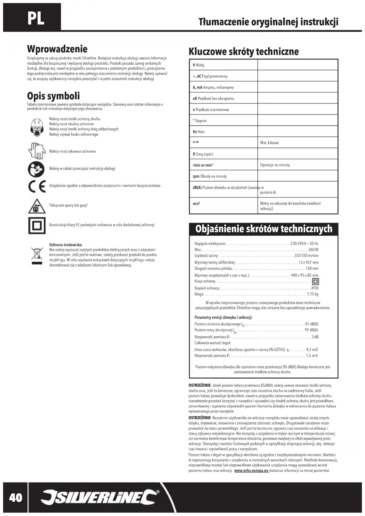 Napięcieelektryczne:..................................... 230-240 V~ 50 Hz Moc:..............................................................260 W Szybkośćtaśmy: . . . . . . . . . . . . . . . . . . . . . . . . . . . . . . . . . . . . . . . . . . . .350-550 m/min Wymiarytaśmyszlierskiej: . . . . . . . . . . . . . . . . . . . . . . . . . . . . . . . . . . . . 13 x 457 mm Długośćramieniapilnika:..........................................130 mm Wymiaryurządzenia(dł.xszer.xwys.):........................440 x 95 x 85 mm Klasaochrony: ....................................................... Stopieńochrony: .....................................................IP20 Waga: ...........................................................1,15 kgWwynikunieprzerwanegoprocesurozwojowegoproduktówdanetechniczneposzczególnychproduktówSilverlinemogąuleczmianiebezuprzedniegopowiadomienia.Parametry emisji dźwięku i wibracji: PoziomciśnieniaakustycznegoL :……..............................81 dB(A)PoziommocyakustycznejL :……………............................92 dB(A) NiepewnośćpomiaruK:…………………. ...............................3 dB Całkowitawartośćdrgań(triaxsumawektorów,określonazgodnieznormąEN60745)a : ........ 4,3 m/s