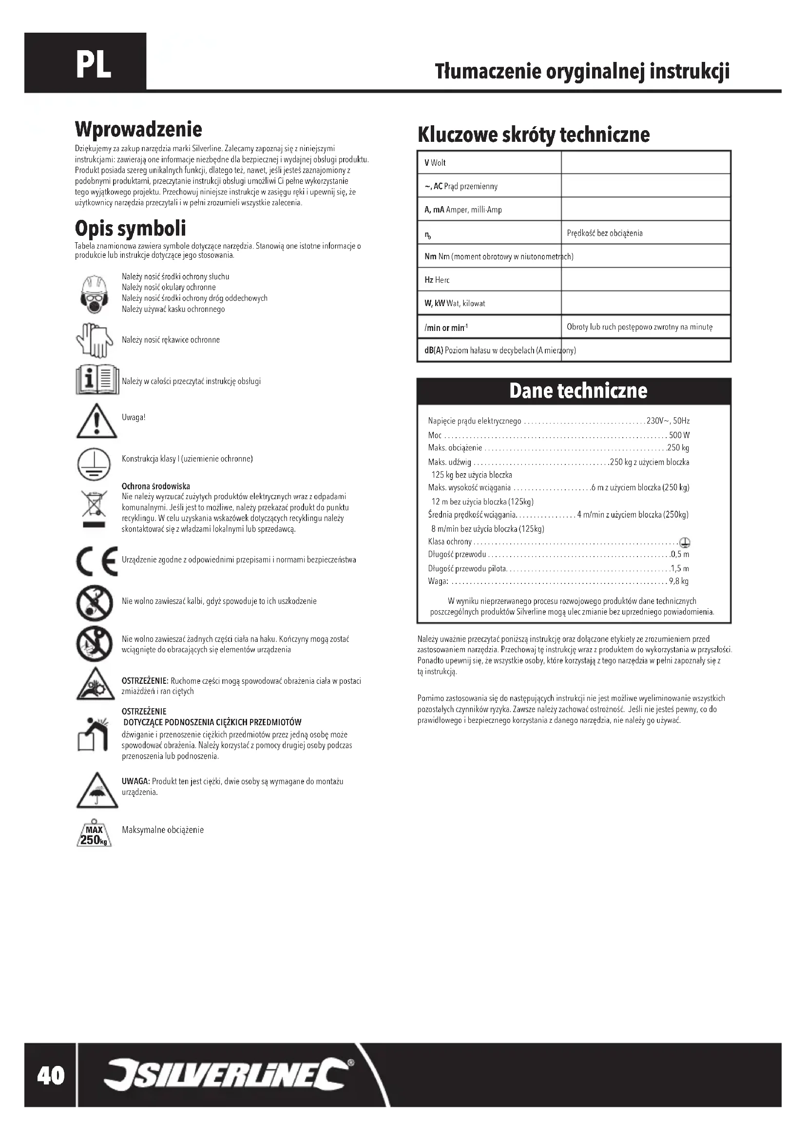 Napięcieprąduelektrycznego ..................................230V~, 50Hz Moc ..............................................................500 W Maks.obciążenie ...................................................250 kg Maks.udźwig ......................................250kgzużyciembloczka 125kgbezużyciabloczka Maks.wysokośćwciągania ......................6mzużyciembloczka(250kg) 12mbezużyciabloczka(125kg)Średniaprędkośćwciągania.................4m/minzużyciembloczka(250kg) 8m/minbezużyciabloczka(125kg) Klasaochrony . . . . . . . . . . . . . . . . . . . . . . . . . . . . . . . . . . . . . . . . . . . . . . . . . . . . . . . . . Długośćprzewodu . . . . . . . . . . . . . . . . . . . . . . . . . . . . . . . . . . . . . . . . . . . . . . . . . . .0,5 m Długośćprzewodupilota..............................................1,5 m Waga: ............................................................9,8 kgWwynikunieprzerwanegoprocesurozwojowegoproduktówdanetechnicznychposzczególnychproduktówSilverlinemogąuleczmianiebezuprzedniegopowiadomienia. Kluczowe skróty techniczne Dane techniczne V Wolt~, AC PrądprzemiennyA, mA Amper, milli-Amp