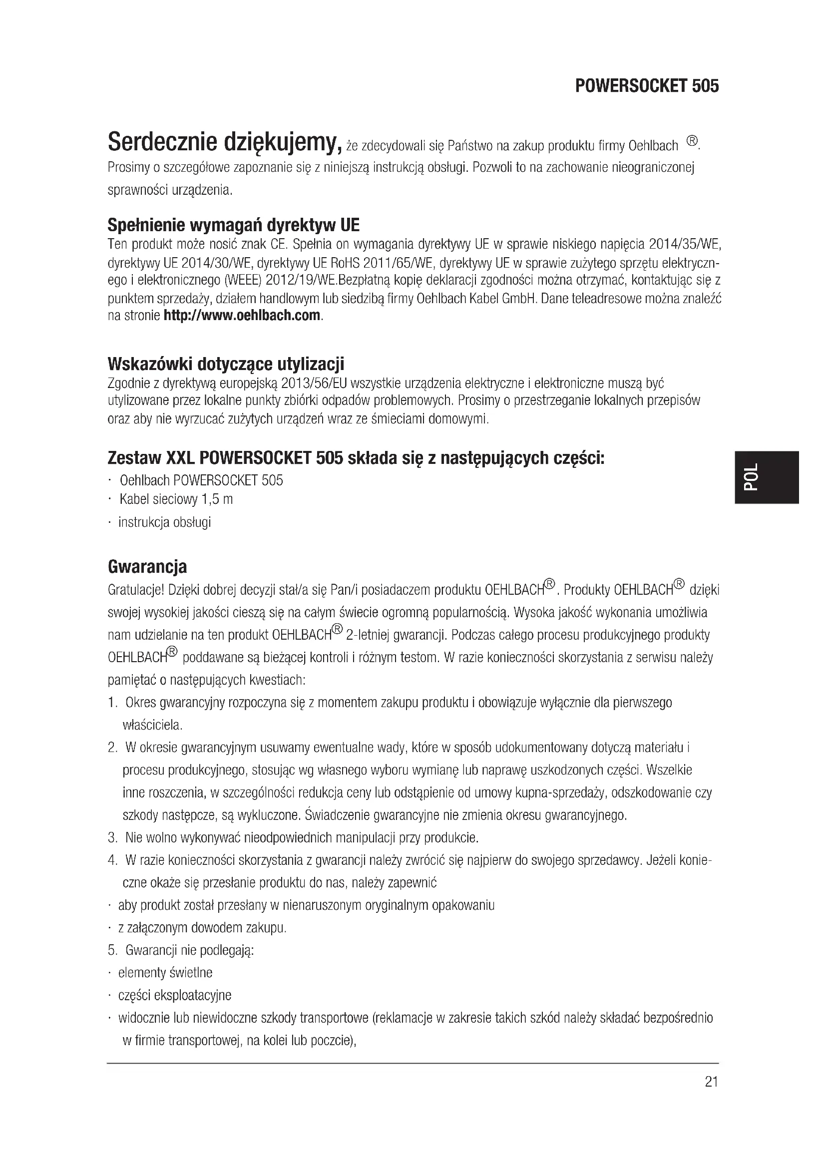 POWERSOCKET 505 Serdecznie dziękujemy, że zdecydowali się Państwo na zakup produktu firmy Oehlbach
