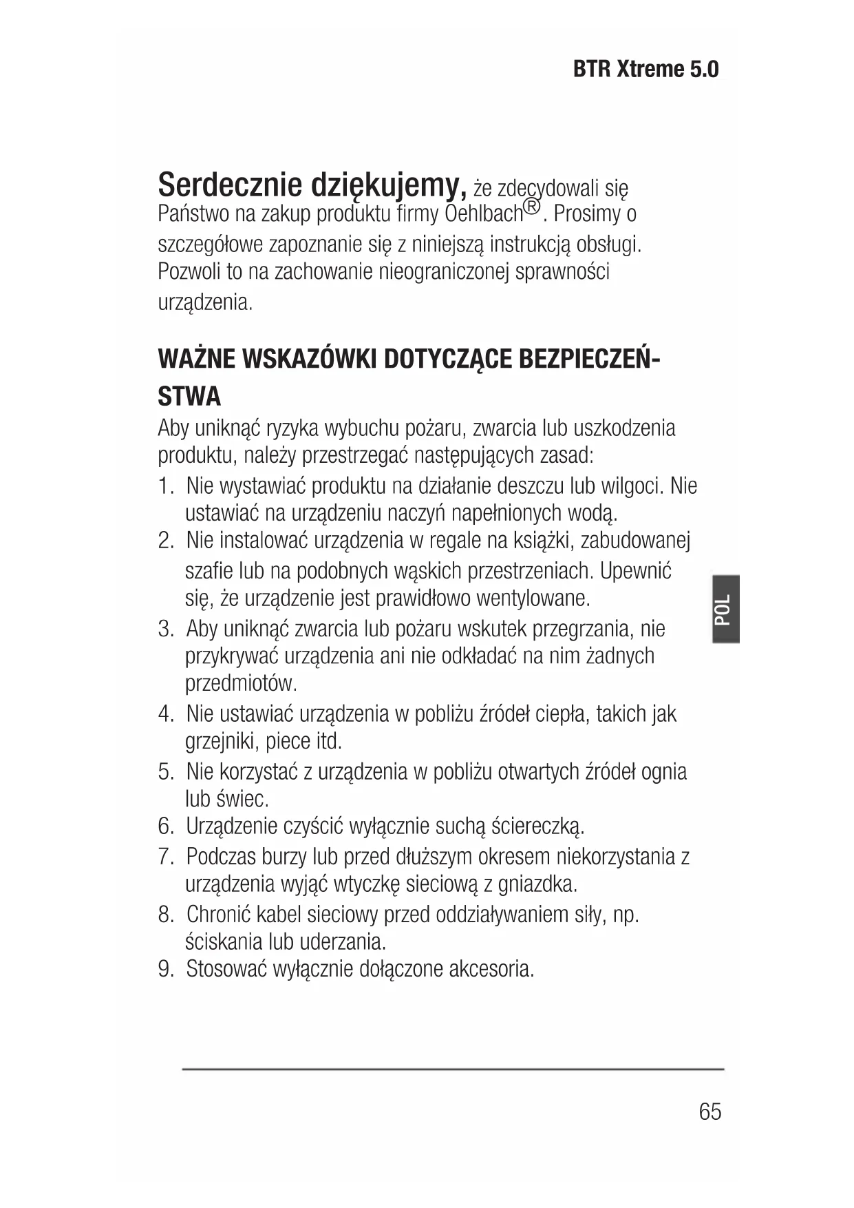 - El reembolso que se pague a terceros por la reparación de daños, sin nuestro previo consentimiento65 BTR Xtreme 5.0 POL Serdecznie dziękujemy, że zdecydowali się Państwo na zakup produktu firmy Oehlbach