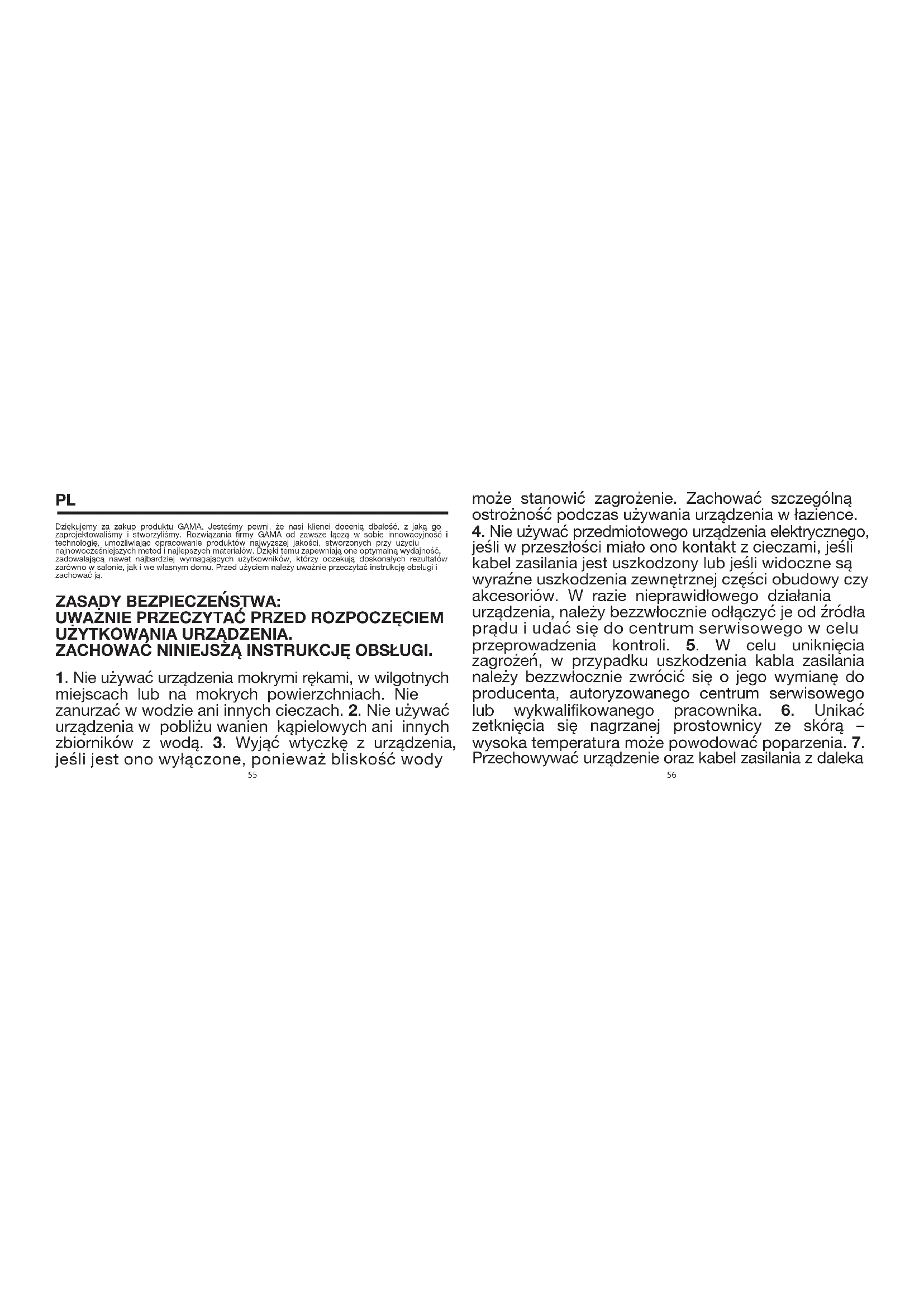 oznacza, że urządzenie nie należy do grupy odpadów komunalnych i w razie likwidacji powinno zostać oddane do odpowiedniego punktu zbiórki urządzeń elektrycznych i elektronicznych w celu recyklingu. Właściwa utylizacja tego produktu pozwala uniknąć potencjalnych negatywnych konsekwencji dla środowiska i zdrowia, jakie mogą wynikać z nieodpowiedniego obchodzenia się z produktem. Dokładniejsze informacje dotyczące recyklingu przedmiotowego produktu można uzyskać w urzędzie miasta, u lokalnego dostawcy usług utylizacji odpadów lub w sklepie, w którym dokonano zakupu. OGRANICZONY OKRES GWARANCJI: okres standardowej gwarancji na prostownice do włosów przeznaczone do sprzedaży konsumenckiej wynosi 24 miesiące, zgodnie z postanowieniami dyrektywy 1999/44/WE. Okres gwarancji dla firm na prostownice do włosów wykorzystywane w salonach piękności lub w ramach jakiejkolwiek innej działalności gospodarczej wynosi 12 miesięcy od daty zakupu. 59 60W obu przypadkach gwarancja jest udzielana na podstawie okazania oryginalnego, czytelnego i nieuszkodzonego dowodu zakupu, ponieważ liczy się widniejąca na nim data i nazwa produktu. UWAGA Oporniki, w które wyposażone jest urządzenie, pokryte są powłoką ochronną. Przy pierwszym podłączeniu i uruchomieniu urządzenia może przez chwilę wydobywać się z niego zapach spalenizny, co jest spowodowane nagrzewaniem się powłoki oporników. Nie stanowi to zagrożenia dla użytkownika i nie świadczy o nieprawidłowym działaniu urządzenia. Przy pierwszym użyciu urządzenia należy uruchomić je i odczekać, aż zapach zniknie. Powinno to nastąpić w ciągu ok. 30 sekund.