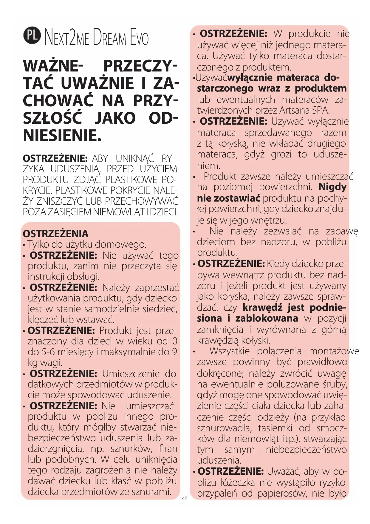 - OSTRZEJELENIE: NIE UZYWAC** produktu w „Trybie Łożeczka" i/lub w „Trybie Co-Sleeping", freieli brakuje jakiegość componentu, freieli jakówkomponent jest uszkodzony lub popsuty.Skontaktuć捂ę z Artsana SPA w celu uzyskania czȩci zaymiennych i instrukcji uzytkowania, freieli zajdzie taka koniecznosć. NIE ZASTEUPOWAC brakujnych czȩci, czȩci uszkodzonych lub złamanych innymi,Nieoryginalnymi i niedzwierdzonymi przyez Artsana SPA czȩsciami.