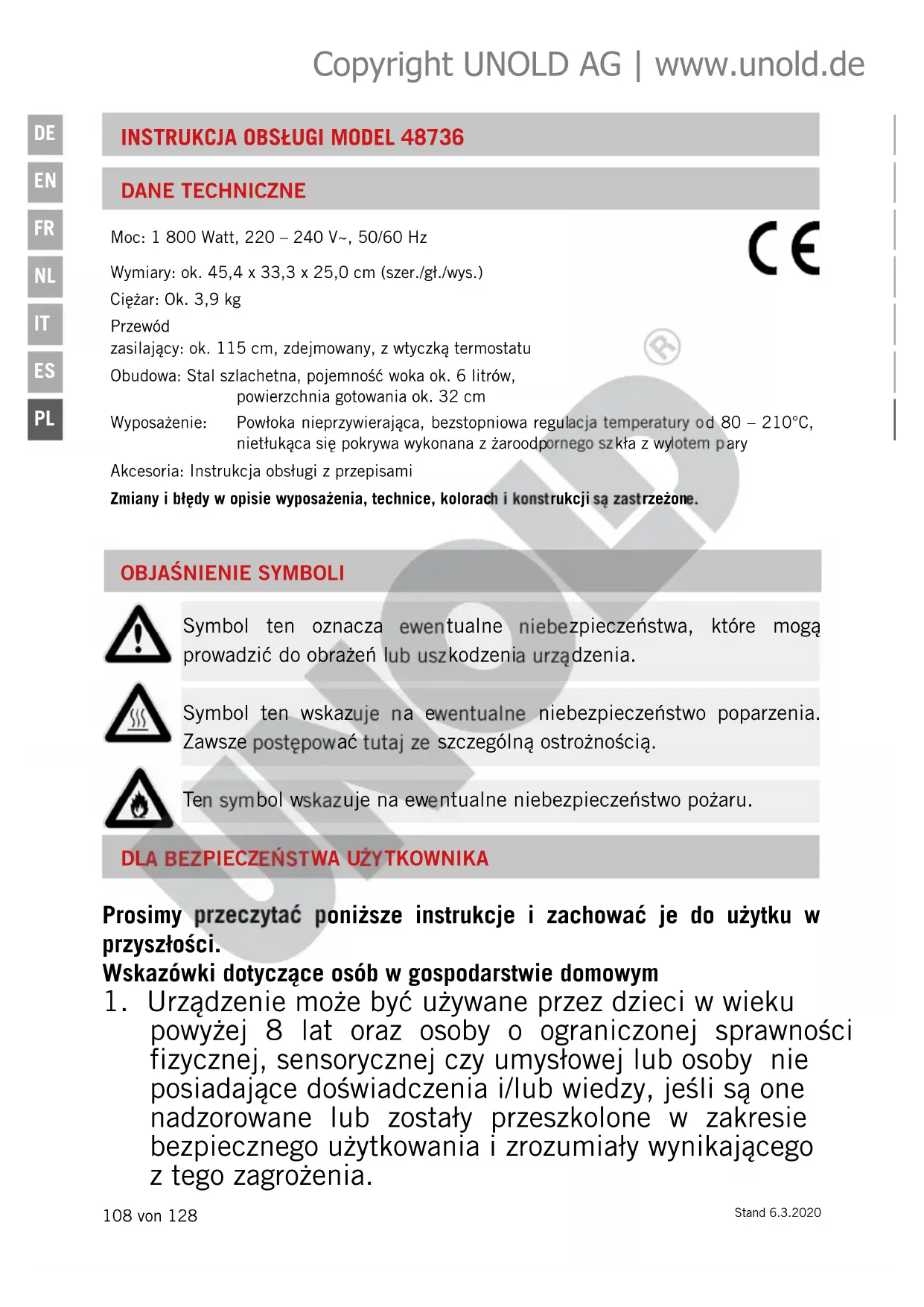 powyżej 8 lat oraz osoby o ograniczonej sprawności fizycznej, sensorycznej czy umysłowej lub osoby nie posiadające doświadczenia i/lub wiedzy, jeśli są one nadzorowane lub zostały przeszkolone w zakresie bezpiecznego użytkowania i zrozumiały wynikającego z tego zagrożenia. Ten symbol wskazuje na ewentualne niebezpieczeństwo pożaru. Copyright UNOLD AG | www.unold.deStand 6.3.2020 109 von 128
