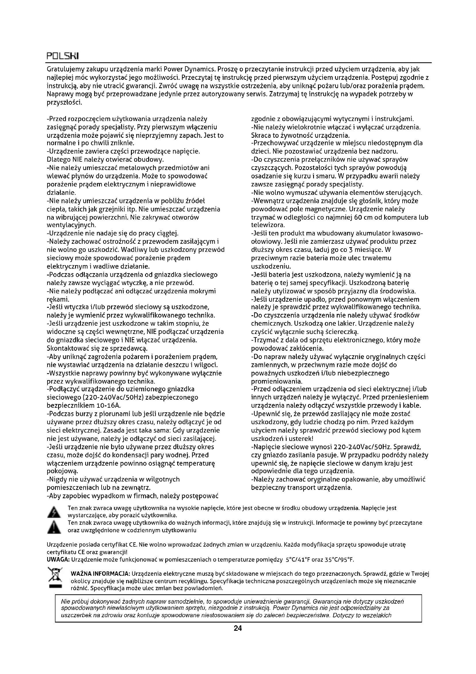 - La radio doit toujours être éloignée d’appareils générant de la chaleur ou émettant des signaux électriques.24 Gratulujemy zakupu urządzenia marki Power Dynamics. Proszę o przeczytanie instrukcji przed użyciem urządzenia, aby jak najlepiej móc wykorzystać jego możliwości. Przeczytaj tę instrukcję przed pierwszym użyciem urządzenia. Postępuj zgodnie z instrukcją, aby nie utracić gwarancji. Zwróć uwagę na wszystkie ostrzeżenia, aby uniknąć pożaru lub/oraz porażenia prądem. Naprawy mogą być przeprowadzane jedynie przez autoryzowany serwis. Zatrzymaj tę instrukcję na wypadek potrzeby w przyszłości. -Przed rozpoczęciem użytkowania urządzenia należy zasięgnąć porady specjalisty. Przy pierwszym włączeniu urządzenia może pojawić się nieprzyjemny zapach. Jest to normalne i po chwili zniknie. -Urządzenie zawiera części przewodzące napięcie. Dlatego NIE należy otwierać obudowy. -Nie należy umieszczać metalowych przedmiotów ani wlewać płynów do urządzenia. Może to spowodować porażenie prądem elektrycznym i nieprawidłowe działanie. -Nie należy umieszczać urządzenia w pobliżu źródeł ciepła, takich jak grzejniki itp. Nie umieszczać urządzenia na wibrującej powierzchni. Nie zakrywać otworów wentylacyjnych. -Urządzenie nie nadaje się do pracy ciągłej. -Należy zachować ostrożność z przewodem zasilającym i nie wolno go uszkodzić. Wadliwy lub uszkodzony przewód sieciowy może spowodować porażenie prądem elektrycznym i wadliwe działanie. -Podczas odłączania urządzenia od gniazdka sieciowego należy zawsze wyciągać wtyczkę, a nie przewód. -Nie należy podłączać ani odłączać urządzenia mokrymi rękami. -Jeśli wtyczka i/lub przewód sieciowy są uszkodzone, należy je wymienić przez wykwalifikowanego technika. -Jeśli urządzenie jest uszkodzone w takim stopniu, że widoczne są części wewnętrzne, NIE podłączać urządzenia do gniazdka sieciowego i NIE włączać urządzenia. Skontaktować się ze sprzedawcą. -Aby uniknąć zagrożenia pożarem i porażeniem prądem, nie wystawiać urządzenia na działanie deszczu i wilgoci. -Wszystkie naprawy powinny być wykonywane wyłącznie przez wykwalifikowanego technika. -Podłączyć urządzenie do uziemionego gniazdka sieciowego (220-240Vac/50Hz) zabezpieczonego bezpiecznikiem 10-16A. -Podczas burzy z piorunami lub jeśli urządzenie nie będzie używane przez dłuższy okres czasu, należy odłączyć je od sieci elektrycznej. Zasada jest taka sama: Gdy urządzenie nie jest używane, należy je odłączyć od sieci zasilającej. -Jeśli urządzenie nie było używane przez dłuższy okres czasu, może dojść do kondensacji pary wodnej. Przed włączeniem urządzenie powinno osiągnąć temperaturę pokojową. -Nigdy nie używać urządzenia w wilgotnych pomieszczeniach lub na zewnątrz. -Aby zapobiec wypadkom w firmach, należy postępować zgodnie z obowiązującymi wytycznymi i instrukcjami. -Nie należy wielokrotnie włączać i wyłączać urządzenia. Skraca to żywotność urządzenia. -Przechowywać urządzenie w miejscu niedostępnym dla dzieci. Nie pozostawiać urządzenia bez nadzoru. -Do czyszczenia przełączników nie używać sprayów czyszczących. Pozostałości tych sprayów powodują osadzanie się kurzu i smaru. W przypadku awarii należy zawsze zasięgnąć porady specjalisty. -Nie wolno wymuszać używania elementów sterujących. -Wewnątrz urządzenia znajduje się głośnik, który może powodować pole magnetyczne. Urządzenie należy trzymać w odległości co najmniej 60 cm od komputera lub telewizora. -Jeśli ten produkt ma wbudowany akumulator kwasowo- ołowiowy. Jeśli nie zamierzasz używać produktu przez dłuższy okres czasu, ładuj go co 3 miesiące. W przeciwnym razie bateria może ulec trwałemu uszkodzeniu. -Jeśli bateria jest uszkodzona, należy wymienić ją na baterię o tej samej specyfikacji. Uszkodzoną baterię należy utylizować w sposób przyjazny dla środowiska. -Jeśli urządzenie upadło, przed ponownym włączeniem należy je sprawdzić przez wykwalifikowanego technika. -Do czyszczenia urządzenia nie należy używać środków chemicznych. Uszkodzą one lakier. Urządzenie należy czyścić wyłącznie suchą ściereczką. -Trzymać z dala od sprzętu elektronicznego, który może powodować zakłócenia. -Do napraw należy używać wyłącznie oryginalnych części zamiennych, w przeciwnym razie może dojść do poważnych uszkodzeń i/lub niebezpiecznego promieniowania. -Przed odłączeniem urządzenia od sieci elektrycznej i/lub innych urządzeń należy je wyłączyć. Przed przeniesieniem urządzenia należy odłączyć wszystkie przewody i kable. -Upewnić się, że przewód zasilający nie może zostać uszkodzony, gdy ludzie chodzą po nim. Przed każdym użyciem należy sprawdzić przewód sieciowy pod kątem uszkodzeń i usterek! -Napięcie sieciowe wynosi 220-240Vac/50Hz. Sprawdź, czy gniazdo zasilania pasuje. W przypadku podróży należy upewnić się, że napięcie sieciowe w danym kraju jest odpowiednie dla tego urządzenia. -Należy zachować oryginalne opakowanie, aby umożliwić bezpieczny transport urządzenia. Ten znak zwraca uwagę użytkownika na wysokie napięcie, które jest obecne w środku obudowy urządzenia. Napięcie jest wystarczające, aby porazić użytkownika. Ten znak zwraca uwagę użytkownika do ważnych informacji, które znajdują się w instrukcji. Informacje te powinny być przeczytane oraz uwzględnione w codziennym użytkowaniu Urządzenie posiada certyfikat CE. Nie wolno wprowadzać żadnych zmian w urządzeniu. Każda modyfikacja sprzętu spowoduje utratę certyfikatu CE oraz gwarancji! UWAGA: Urządzenie może funkcjonować w pomieszczeniach o temperaturze pomiędzy 5°C/41°F oraz 35°C/95°F. WAŻNA INFORMACJA: Urządzenia elektryczne muszą być składowane w miejscach do tego przeznaczonych. Sprawdź, gdzie w Twojej okolicy znajduje się n