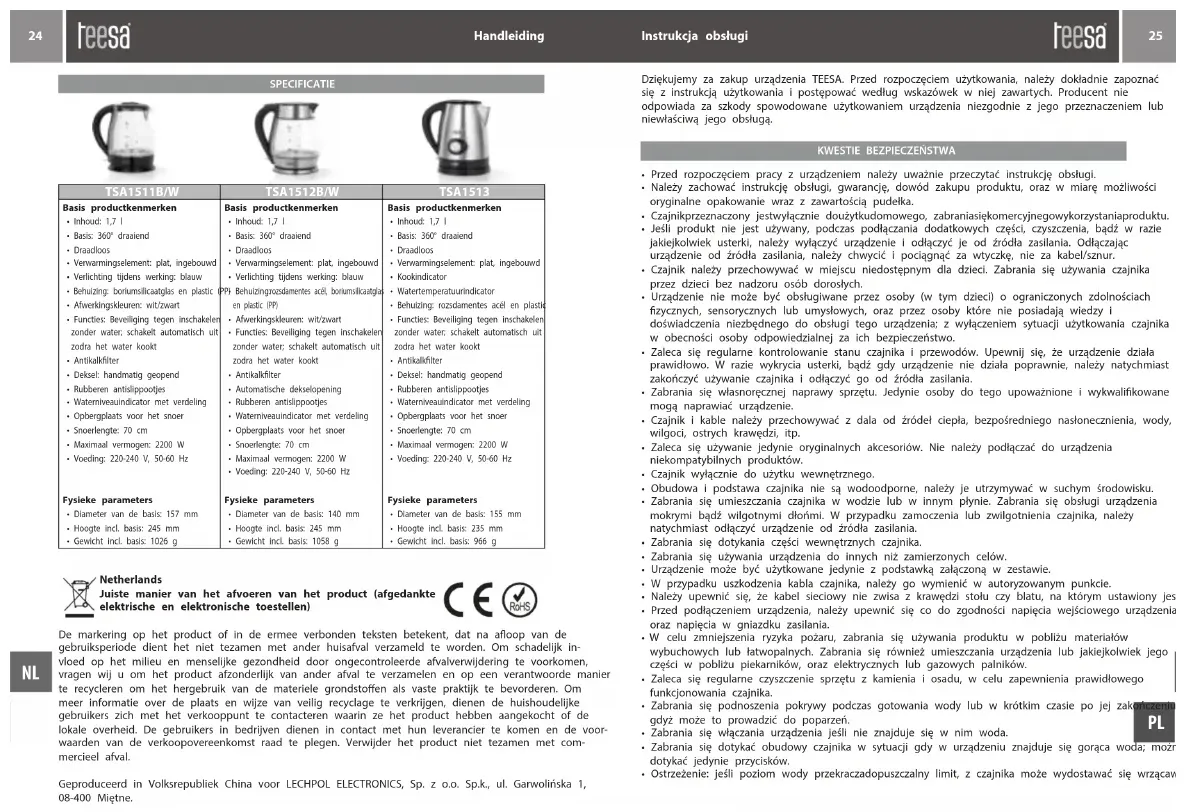 - Diameter van de basis: 155 mm• Hoogte incl. basis: 235 mm• Gewicht incl. basis: 966 g Handleiding24 NLPoland Prawidłowe usuwanie produktu (Zużyty sprzęt elektryczny i elektroniczny) Oznaczenie umieszczone na produkcie lub w odnoszących się do niego tekstach wskazuje, że po upływie okresu użytkowania nie należy usuwać z innymi odpadami pochodzącymi z gospodarstw domowych. Aby uniknąć szkodliwego wpływu na środowisko naturalne i zdrowie ludzi wskutek niekontrolowanego usuwania odpadów, prosimy o oddzielenie produktu od innego typu odpadów oraz odpowiedzialny recykling w celu promowania ponownego użycia zasobów materialnych jako stałej praktyki. W celu uzyskania informacji na temat miejsca i sposobu bezpiecznego dla środowiska recyklingu tego produktu użytkownicy w gospodarstwach domowych powinni skontaktować się z punktem sprzedaży detalicznej, w którym dokonali zakupu produktu, lub z organem władz lokalnych. Użytkownicy w rmach powinni skontaktować się ze swoim dostawcą i sprawdzić warunki umowy zakupu. Produktu nie należy usuwać razem z innymi odpadami komercyjnymi. Wyprodukowano w CHRL dla LECHPOL ELECTRONICS Sp. z o.o. Sp.K., Ul. Garwolińska 1, 08-400 Miętne. SPECYFIKACJA TSA1511B/W TSA1512B/W TSA1513 Podstawowe cechy produktu