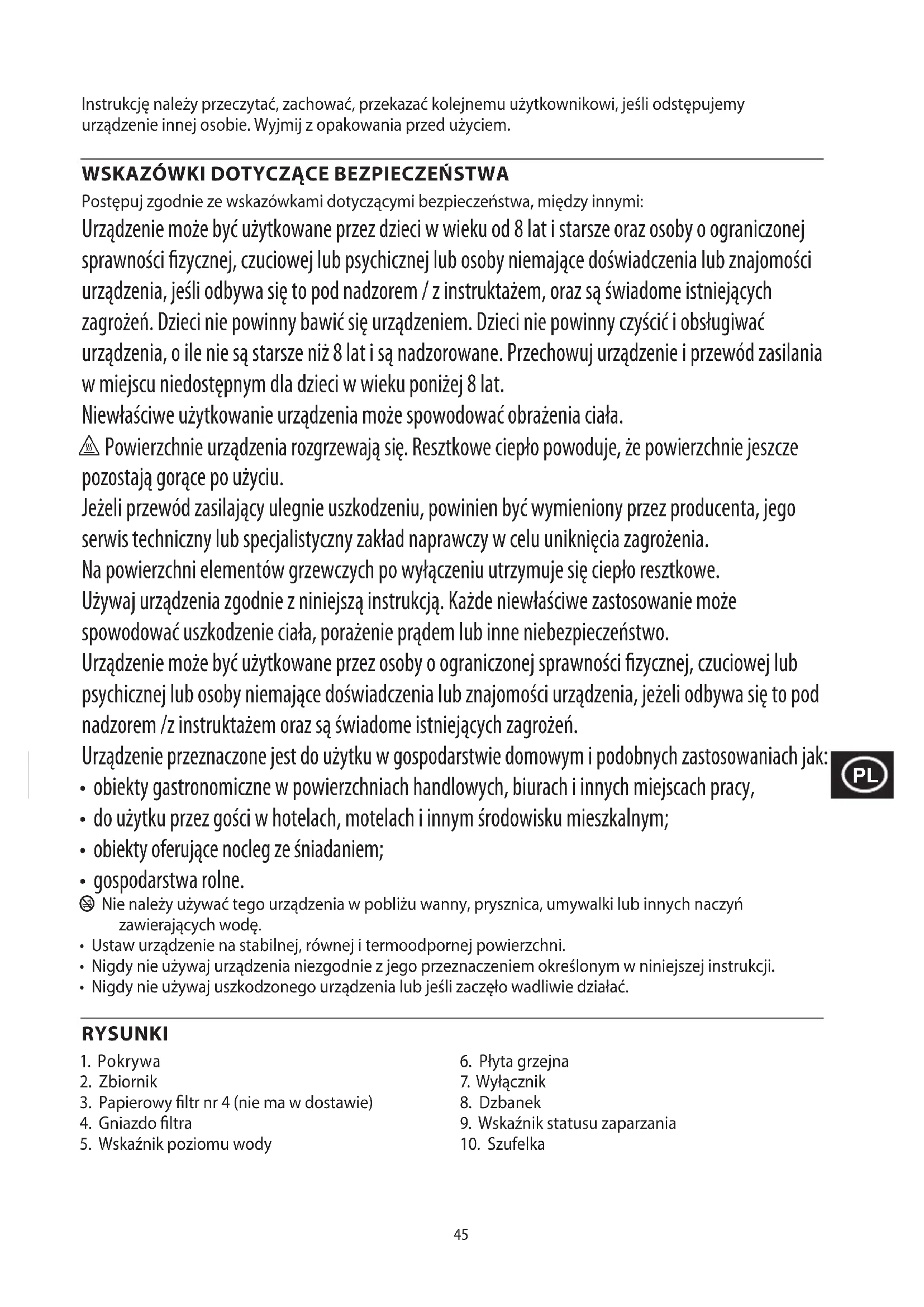 Postępuj zgodnie ze wskazówkami dotyczącymi bezpieczeństwa, między innymi: Urządzenie może być użytkowane przez dzieci w wieku od 8 lat i starsze oraz osoby o ograniczonej sprawności fizycznej, czuciowej lub psychicznej lub osoby niemające doświadczenia lub znajomości urządzenia, jeśli odbywa się to pod nadzorem / z instruktażem, oraz są świadome istniejących zagrożeń. Dzieci nie powinny bawić się urządzeniem. Dzieci nie powinny czyścić i obsługiwać urządzenia, o ile nie są starsze niż 8 lat i są nadzorowane. Przechowuj urządzenie i przewód zasilania w miejscu niedostępnym dla dzieci w wieku poniżej 8 lat. Niewłaściwe użytkowanie urządzenia może spowodować obrażenia ciała. h Powierzchnie urządzenia rozgrzewają się. Resztkowe ciepło powoduje, że powierzchnie jeszcze pozostają gorące po użyciu. Jeżeli przewód zasilający ulegnie uszkodzeniu, powinien być wymieniony przez producenta, jego serwis techniczny lub specjalistyczny zakład naprawczy w celu uniknięcia zagrożenia. Na powierzchni elementów grzewczych po wyłączeniu utrzymuje się ciepło resztkowe. Używaj urządzenia zgodnie z niniejszą instrukcją. Każde niewłaściwe zastosowanie może spowodować uszkodzenie ciała, porażenie prądem lub inne niebezpieczeństwo. Urządzenie może być użytkowane przez osoby o ograniczonej sprawności fizycznej, czuciowej lub psychicznej lub osoby niemające doświadczenia lub znajomości urządzenia, jeżeli odbywa się to pod nadzorem /z instruktażem oraz są świadome istniejących zagrożeń. Urządzenie przeznaczone jest do użytku w gospodarstwie domowym i podobnych zastosowaniach jak: