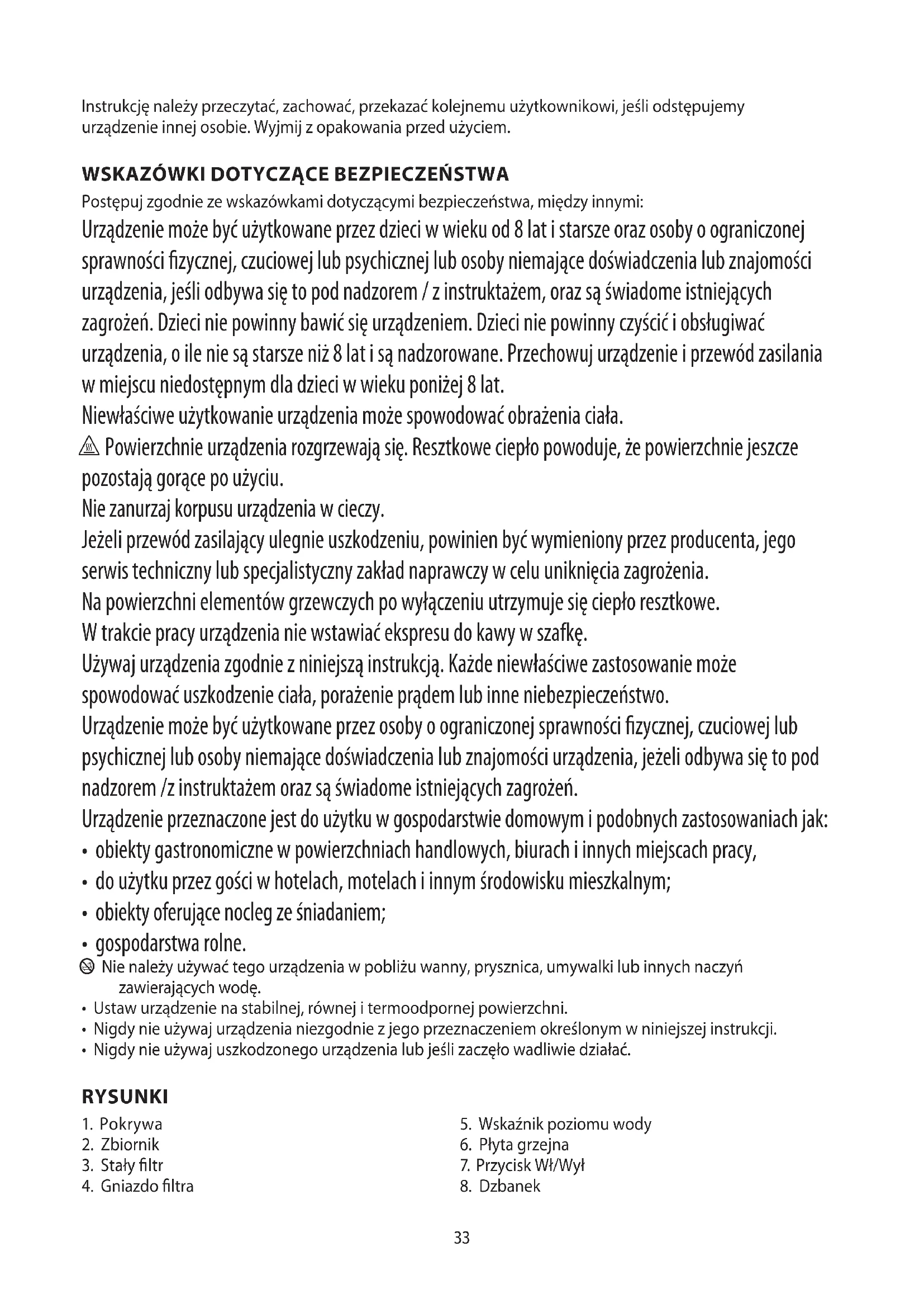 Postępuj zgodnie ze wskazówkami dotyczącymi bezpieczeństwa, między innymi: Urządzenie może być użytkowane przez dzieci w wieku od 8 lat i starsze oraz osoby o ograniczonej sprawności zycznej, czuciowej lub psychicznej lub osoby niemające doświadczenia lub znajomości urządzenia, jeśli odbywa się to pod nadzorem / z instruktażem, oraz są świadome istniejących zagrożeń. Dzieci nie powinny bawić się urządzeniem. Dzieci nie powinny czyścić i obsługiwać urządzenia, o ile nie są starsze niż 8 lat i są nadzorowane. Przechowuj urządzenie i przewód zasilania w miejscu niedostępnym dla dzieci w wieku poniżej 8 lat. Niewłaściwe użytkowanie urządzenia może spowodować obrażenia ciała. h Powierzchnie urządzenia rozgrzewają się. Resztkowe ciepło powoduje, że powierzchnie jeszcze pozostają gorące po użyciu. Nie zanurzaj korpusu urządzenia w cieczy. Jeżeli przewód zasilający ulegnie uszkodzeniu, powinien być wymieniony przez producenta, jego serwis techniczny lub specjalistyczny zakład naprawczy w celu uniknięcia zagrożenia. Na powierzchni elementów grzewczych po wyłączeniu utrzymuje się ciepło resztkowe. W trakcie pracy urządzenia nie wstawiać ekspresu do kawy w szafkę. Używaj urządzenia zgodnie z niniejszą instrukcją. Każde niewłaściwe zastosowanie może spowodować uszkodzenie ciała, porażenie prądem lub inne niebezpieczeństwo. Urządzenie może być użytkowane przez osoby o ograniczonej sprawności zycznej, czuciowej lub psychicznej lub osoby niemające doświadczenia lub znajomości urządzenia, jeżeli odbywa się to pod nadzorem /z instruktażem oraz są świadome istniejących zagrożeń. Urządzenie przeznaczone jest do użytku w gospodarstwie domowym i podobnych zastosowaniach jak: