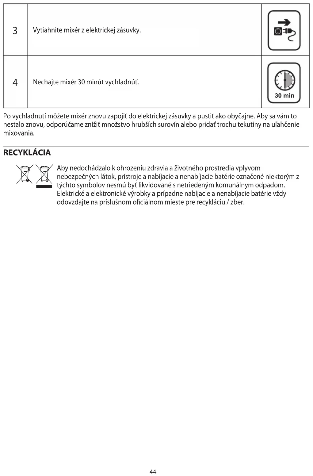 Pozostaw blender do ostygnięcia przez 30 minut. 30 min Po ostygnięciu możesz podłączyć blender i ponownie uruchomić go w zwykły sposób. Aby zapobiec przeciążeniu, zalecamy zmniejszenie ilości grubszych składników lub dodanie odrobiny płynu, aby ułatwić ich mieszanie. RECYKLING