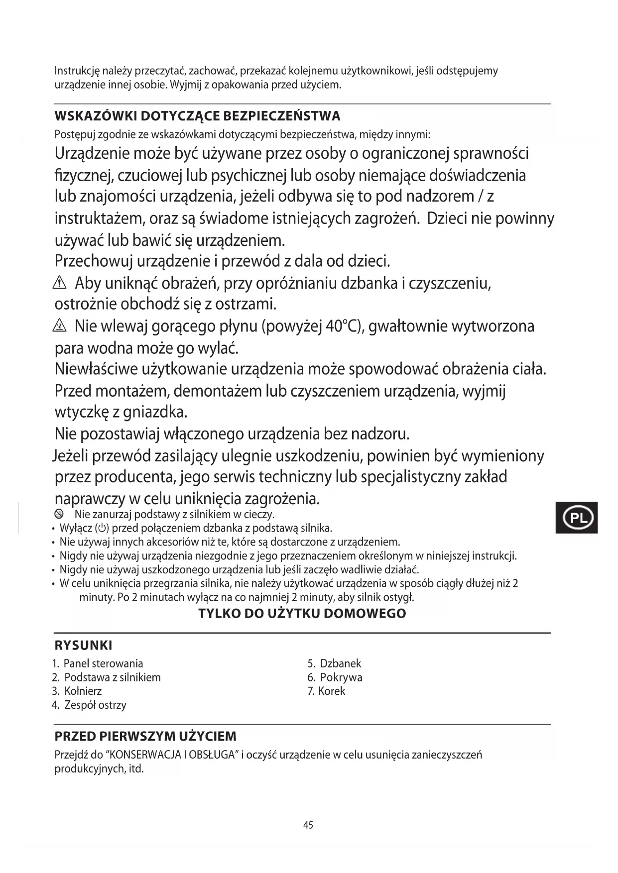 Postępuj zgodnie ze wskazówkami dotyczącymi bezpieczeństwa, między innymi: Urządzenie może być używane przez osoby o ograniczonej sprawności zycznej, czuciowej lub psychicznej lub osoby niemające doświadczenia lub znajomości urządzenia, jeżeli odbywa się to pod nadzorem / z instruktażem, oraz są świadome istniejących zagrożeń. Dzieci nie powinny używać lub bawić się urządzeniem. Przechowuj urządzenie i przewód z dala od dzieci. c Aby uniknąć obrażeń, przy opróżnianiu dzbanka i czyszczeniu, ostrożnie obchodź się z ostrzami. h Nie wlewaj gorącego płynu (powyżej 40°C), gwałtownie wytworzona para wodna może go wylać. Niewłaściwe użytkowanie urządzenia może spowodować obrażenia ciała. Przed montażem, demontażem lub czyszczeniem urządzenia, wyjmij wtyczkę z gniazdka. Nie pozostawiaj włączonego urządzenia bez nadzoru. Jeżeli przewód zasilający ulegnie uszkodzeniu, powinien być wymieniony przez producenta, jego serwis techniczny lub specjalistyczny zakład naprawczy w celu uniknięcia zagrożenia. l Nie zanurzaj podstawy z silnikiem w cieczy.