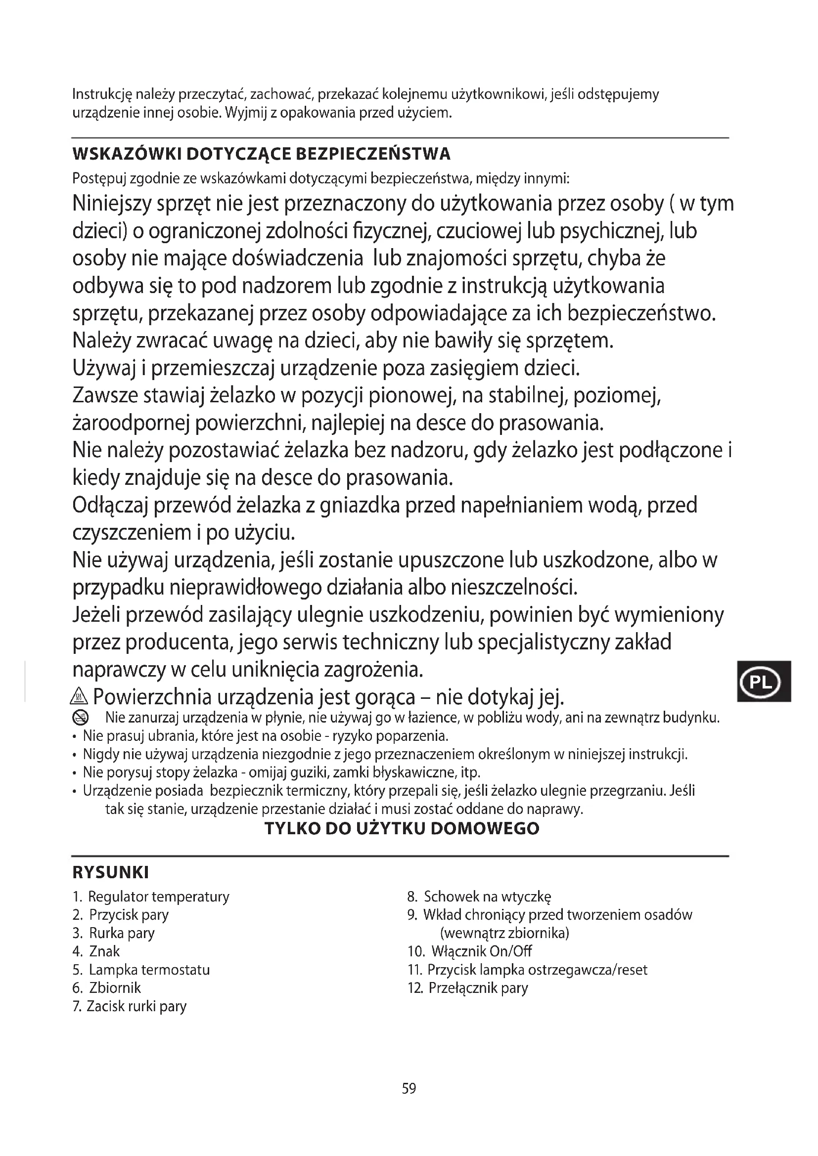 Postępuj zgodnie ze wskazówkami dotyczącymi bezpieczeństwa, między innymi: Niniejszy sprzęt nie jest przeznaczony do użytkowania przez osoby ( w tym dzieci) o ograniczonej zdolności zycznej, czuciowej lub psychicznej, lub osoby nie mające doświadczenia lub znajomości sprzętu, chyba że odbywa się to pod nadzorem lub zgodnie z instrukcją użytkowania sprzętu, przekazanej przez osoby odpowiadające za ich bezpieczeństwo. Należy zwracać uwagę na dzieci, aby nie bawiły się sprzętem. Używaj i przemieszczaj urządzenie poza zasięgiem dzieci. Zawsze stawiaj żelazko w pozycji pionowej, na stabilnej, poziomej, żaroodpornej powierzchni, najlepiej na desce do prasowania. Nie należy pozostawiać żelazka bez nadzoru, gdy żelazko jest podłączone i kiedy znajduje się na desce do prasowania. Odłączaj przewód żelazka z gniazdka przed napełnianiem wodą, przed czyszczeniem i po użyciu. Nie używaj urządzenia, jeśli zostanie upuszczone lub uszkodzone, albo w przypadku nieprawidłowego działania albo nieszczelności. Jeżeli przewód zasilający ulegnie uszkodzeniu, powinien być wymieniony przez producenta, jego serwis techniczny lub specjalistyczny zakład naprawczy w celu uniknięcia zagrożenia. h Powierzchnia urządzenia jest gorąca – nie dotykaj jej.