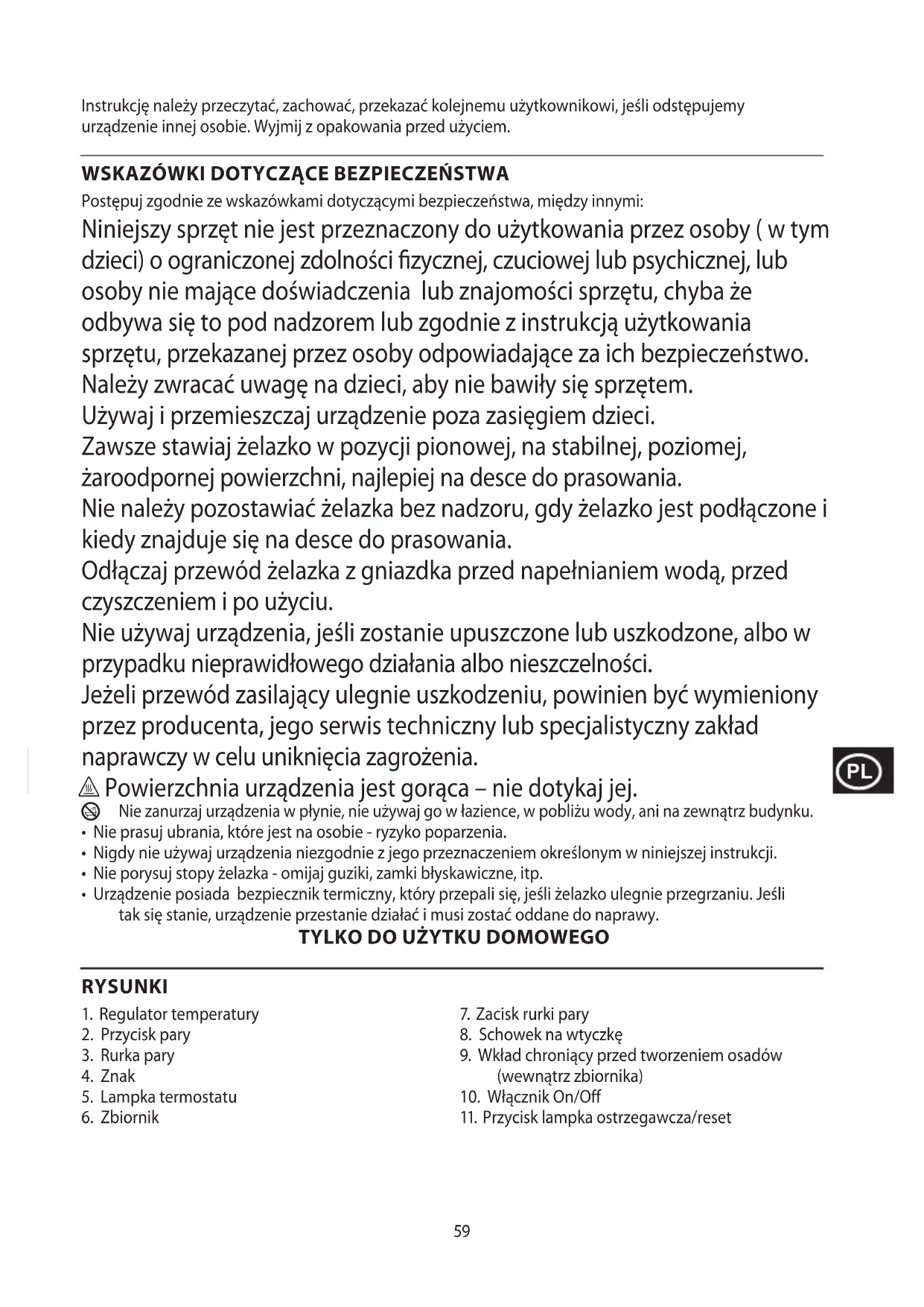 Postępuj zgodnie ze wskazówkami dotyczącymi bezpieczeństwa, między innymi: Niniejszy sprzęt nie jest przeznaczony do użytkowania przez osoby ( w tym dzieci) o ograniczonej zdolności zycznej, czuciowej lub psychicznej, lub osoby nie mające doświadczenia lub znajomości sprzętu, chyba że odbywa się to pod nadzorem lub zgodnie z instrukcją użytkowania sprzętu, przekazanej przez osoby odpowiadające za ich bezpieczeństwo. Należy zwracać uwagę na dzieci, aby nie bawiły się sprzętem. Używaj i przemieszczaj urządzenie poza zasięgiem dzieci. Zawsze stawiaj żelazko w pozycji pionowej, na stabilnej, poziomej, żaroodpornej powierzchni, najlepiej na desce do prasowania. Nie należy pozostawiać żelazka bez nadzoru, gdy żelazko jest podłączone i kiedy znajduje się na desce do prasowania. Odłączaj przewód żelazka z gniazdka przed napełnianiem wodą, przed czyszczeniem i po użyciu. Nie używaj urządzenia, jeśli zostanie upuszczone lub uszkodzone, albo w przypadku nieprawidłowego działania albo nieszczelności. Jeżeli przewód zasilający ulegnie uszkodzeniu, powinien być wymieniony przez producenta, jego serwis techniczny lub specjalistyczny zakład naprawczy w celu uniknięcia zagrożenia. h Powierzchnia urządzenia jest gorąca – nie dotykaj jej.