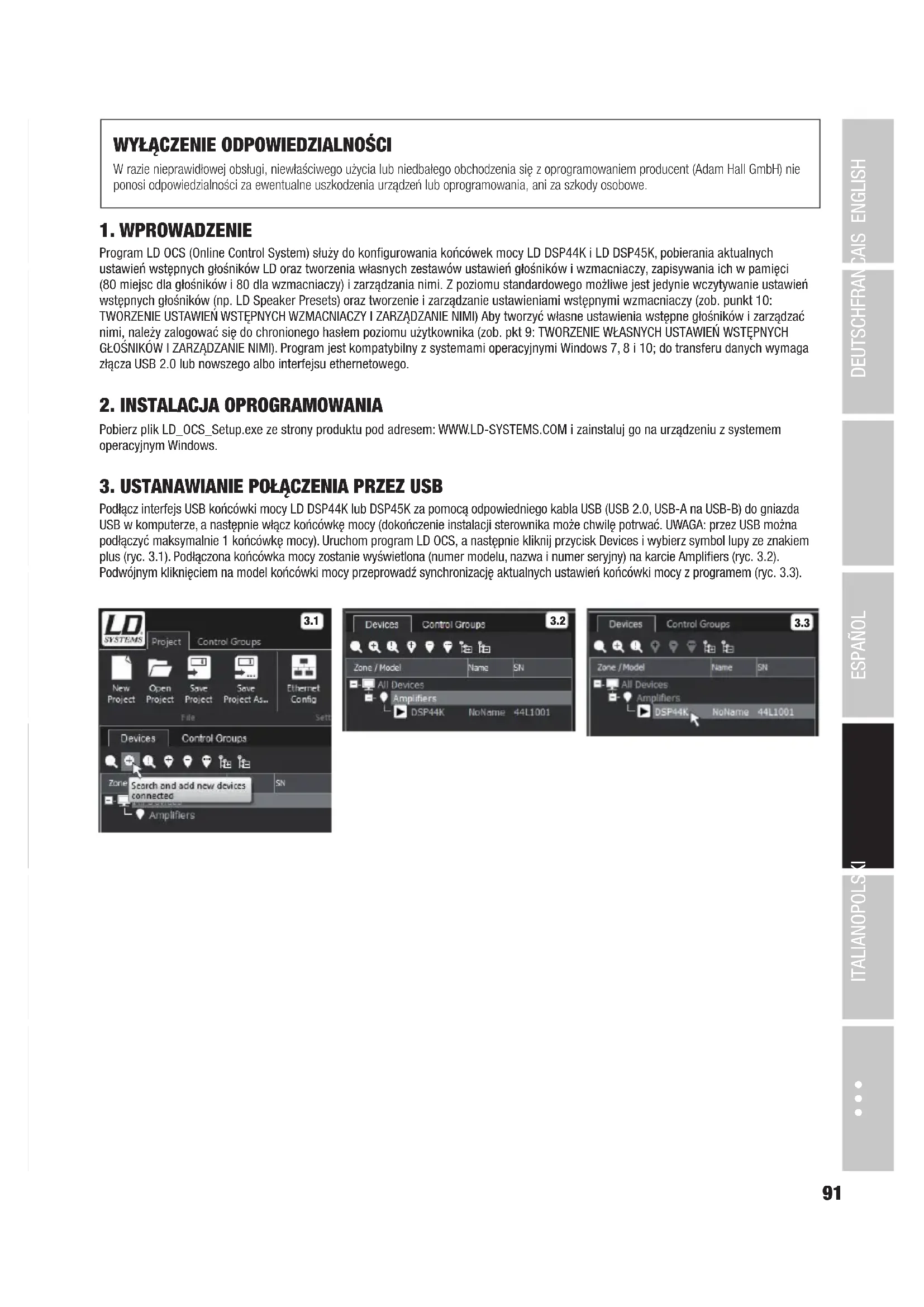 Program LD OCS (Online Control System) służy do konfigurowania końcówek mocy LD DSP44K i LD DSP45K, pobierania aktualnych ustawień wstępnych głośników LD oraz tworzenia własnych zestawów ustawień głośników i wzmacniaczy, zapisywania ich w pamięci (80 miejsc dla głośników i 80 dla wzmacniaczy) i zarządzania nimi. Z poziomu standardowego możliwe jest jedynie wczytywanie ustawień wstępnych głośników (np. LD Speaker Presets) oraz tworzenie i zarządzanie ustawieniami wstępnymi wzmacniaczy (zob. punkt 10: TWORZENIE USTAWIEŃ WSTĘPNYCH WZMACNIACZY I ZARZĄDZANIE NIMI) Aby tworzyć własne ustawienia wstępne głośników i zarządzać nimi, należy zalogować się do chronionego hasłem poziomu użytkownika (zob. pkt 9: TWORZENIE WŁASNYCH USTAWIEŃ WSTĘPNYCH GŁOŚNIKÓW I ZARZĄDZANIE NIMI). Program jest kompatybilny z systemami operacyjnymi Windows 7, 8 i 10; do transferu danych wymaga złącza USB 2.0 lub nowszego albo interfejsu ethernetowego.