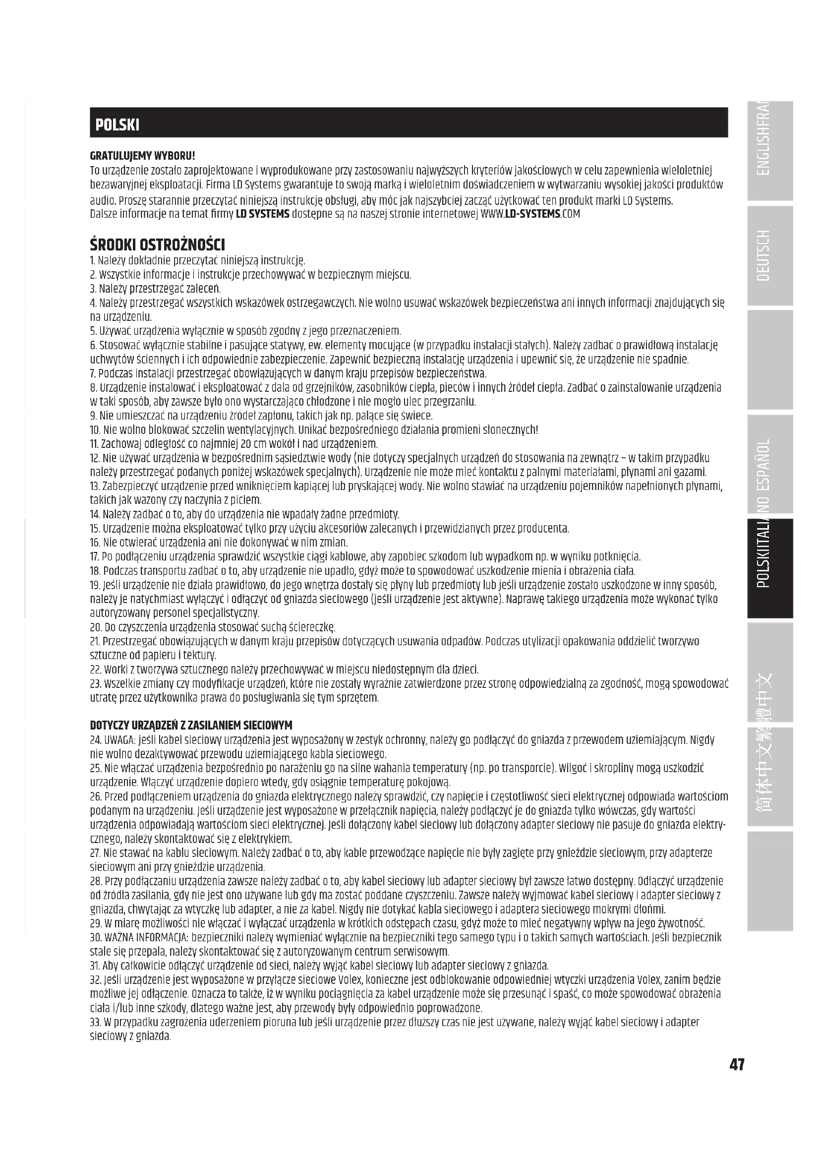 POLSKI GRATULUJEMY WYBORU! To urządzenie zostało zaprojektowane i wyprodukowane przy zastosowaniu najwyższych kryteriów jakościowych w celu zapewnienia wieloletniej bezawaryjnej eksploatacji. Firma LD Systems gwarantuje to swoją marką i wieloletnim doświadczeniem w wytwarzaniu wysokiej jakości produktów audio. Proszę starannie przeczytać niniejszą instrukcję obsługi, aby móc jak najszybciej zacząć użytkować ten produkt marki LD Systems. Dalsze informacje na temat rmy LD SYSTEMS dostępne są na naszej stronie internetowej WWW.LD-SYSTEMS.COM