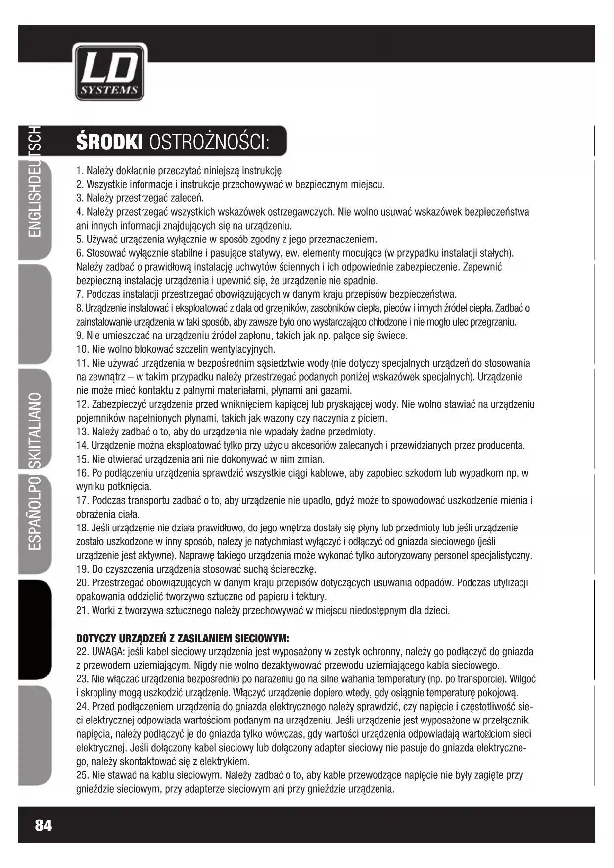 ENGLISHDEUTSCHFRANCAIS FRANCAISFRANCAIS FRANCAISFRANCAIS ESpAñoLpoLSKIITALIANo Gratulujemy wyboru! To urządzenie zostało zaprojektowane i wyprodukowane przy zastosowaniu najwyższych kryteriów jakościowych w celu zapewnienia wieloletniej bezawaryjnej eksploatacji. Firma LD Systems gwarantuje to swoją marką i wieloletnim doświadczeniem w wytwarzaniu wysokiej jakości produktów audio. Proszę starannie przeczytać niniejszą instrukcję obsługi, aby móc jak najszybciej zacząć użytkować ten produkt marki LD Systems. Dalsze informacje na temat firmy LD SYSTEMS dostępne są na naszej stronie internetowej WWW.LD-SYSTeMS.COMcZterostreFowy mikSer rack LDzONE624