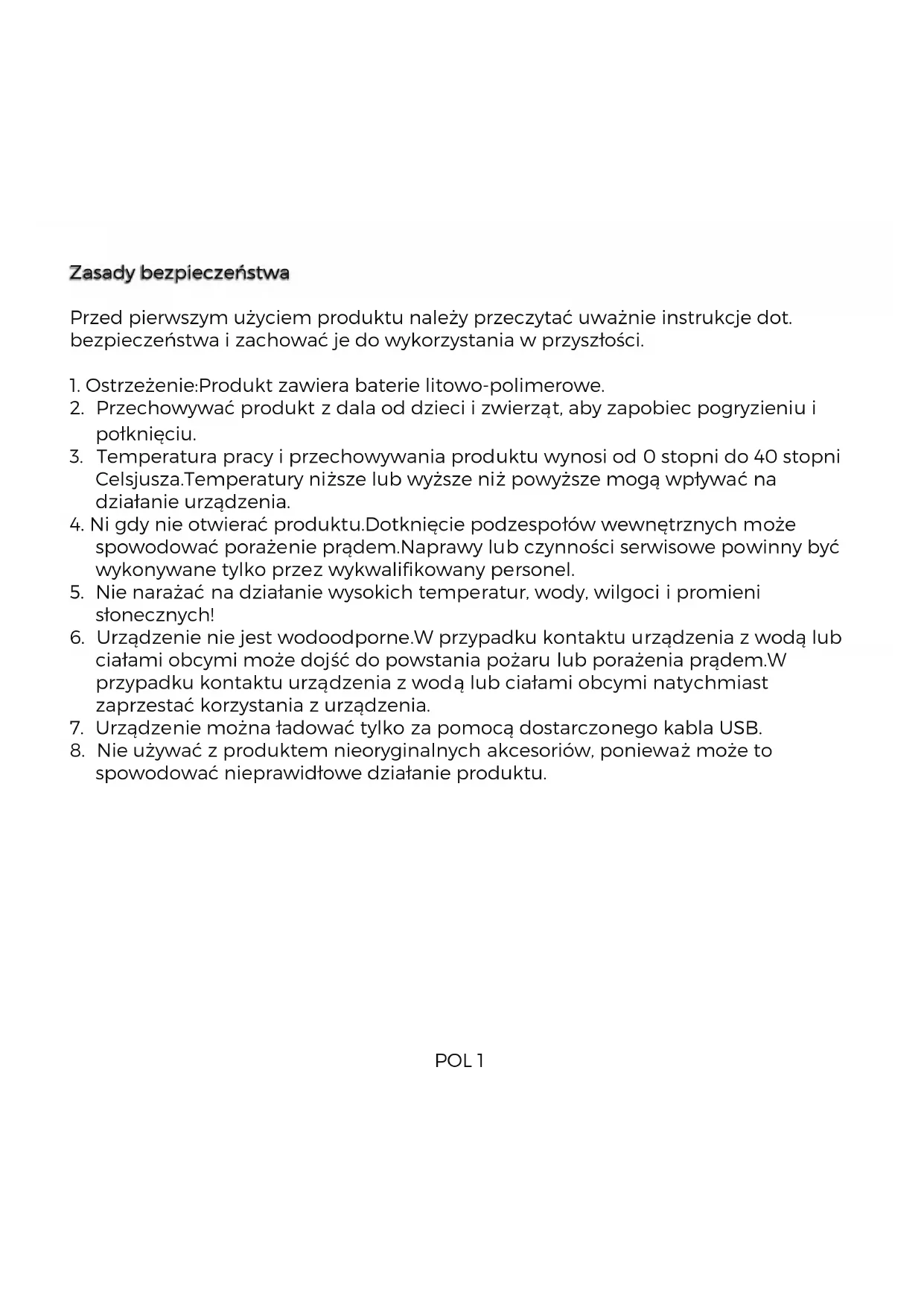 1. Ostrzeżenie:Produkt zawiera baterie litowo-polimerowe.