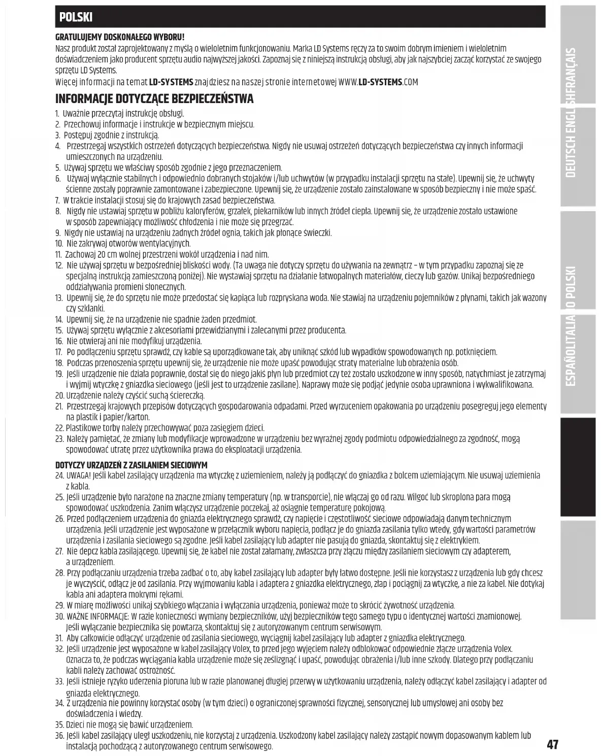 Adam Hall GmbH declara por la presente que este tipo de equipo de radio cumple con la Directiva 2014/53/UE. El texto completo de la declaración de conformidad de la UE está disponible en la siguiente dirección Dirección de Internet disponible: www.adamhall.com/compliance/ ¡Los errores de imprenta y los errores, así como los cambios técnicos o de otro tipo están reservados! DEUTSCHENGLISH ITALIANO POLSKI ESPAÑOL FRANÇAIS47 POLSKI GRATULUJEMY DOSKONAŁEGO WYBORU! Nasz produkt został zaprojektowany zmyślą owieloletnim funkcjonowaniu. Marka LDSystems ręczy za to swoim dobrym imieniem iwieloletnim doświadczeniem jako producent sprzętu audio najwyższej jakości. Zapoznaj się zniniejszą instrukcją obsługi, aby jak najszybciej zacząć korzystać ze swojego sprzętu LDSystems. Więcej informacji na temat LD-SYSTEMS znajdziesz na naszej stronie internetowej WWW.LD-SYSTEMS.COM
