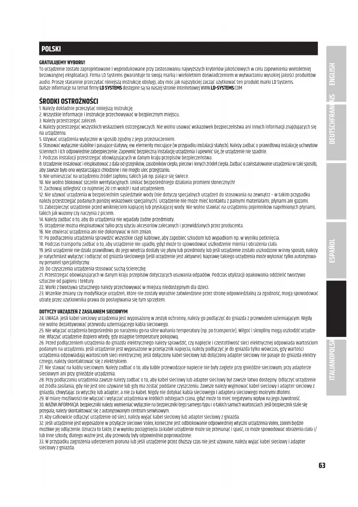 Conector: Mini XLR de 3 pines Mini XLR de 3 pines Mini XLR de 3 pines Accesorios incluidos: espuma antiviento espuma antiviento espuma antiviento CABLE PARA GUITARRA PARA TRANSMISOR DE PETACA Número de artículo: LDWS100GC Conector 1: Mini XLR de 3 pines Conector 2: jack de 6,3 mm Longitud del cable: 1,5 m63 DEUTSCHFRANCAIS ESPAÑOL ENGLISH ITALIANO POLSKI POLSKI GRATULUJEMY WYBORU! To urządzenie zostało zaprojektowane i wyprodukowane przy zastosowaniu najwyższych kryteriów jakościowych w celu zapewnienia wieloletniej bezawaryjnej eksploatacji. Firma LD Systems gwarantuje to swoją marką i wieloletnim doświadczeniem w wytwarzaniu wysokiej jakości produktów audio. Proszę starannie przeczytać niniejszą instrukcję obsługi, aby móc jak najszybciej zacząć użytkować ten produkt marki LD Systems. Dalsze informacje na temat rmy LD SYSTEMS dostępne są na naszej stronie internetowej WWW.LD-SYSTEMS.COM