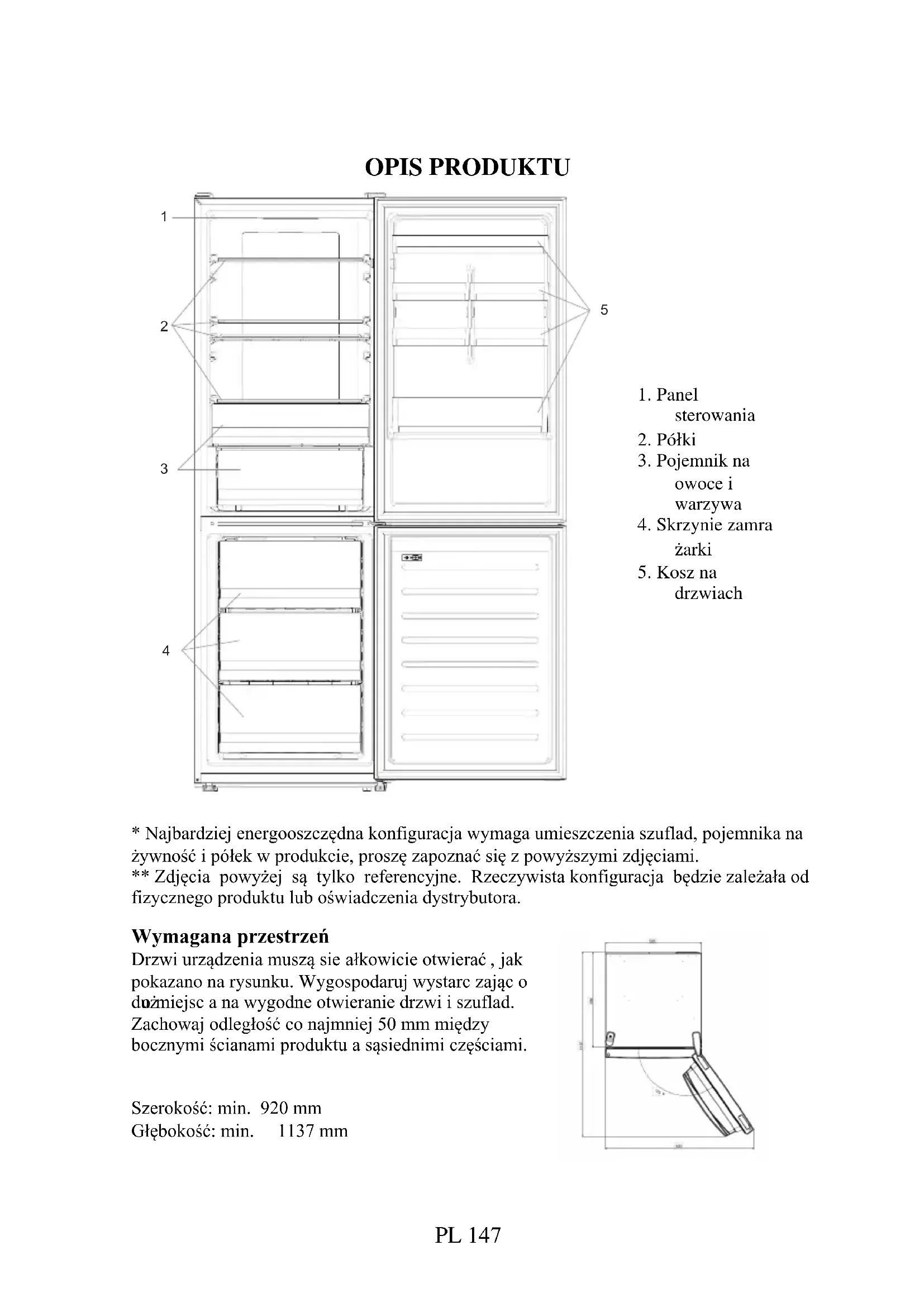 - Najbardziej energooszczędna konfiguracja wymaga umieszczenia szuflad, pojemnika na żywność i półek w produkcie, proszę zapoznać się z powyższymi zdjęciami. ** Zdjęcia powyżej są tylko referencyjne. Rzeczywista konfiguracja będzie zależała od fizycznego produktu lub oświadczenia dystrybutora. Wymagana przestrzeń Drzwi urządzenia muszą sie ałkowicie otwierać , jak pokazano na rysunku. Wygospodaruj wystarc zając o dużo miejsc a na wygodne otwieranie drzwi i szuflad. Zachowaj odległość co najmniej 50 mm między bocznymi ścianami produktu a sąsiednimi częściami. Szerokość: min. 920 mm Głębokość: min. 1137 mm