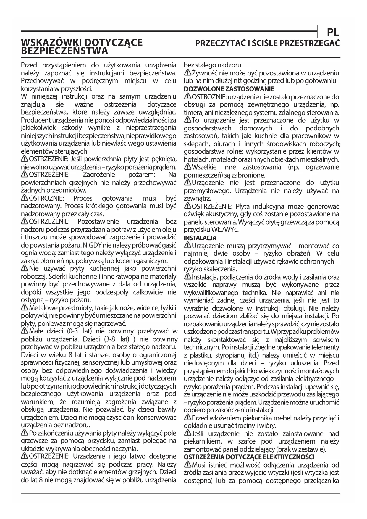 Manuale d’uso ITPrzed przystąpieniem do użytkowania urządzenia należy zapoznać się instrukcjami bezpieczeństwa. Przechowywać w podręcznym miejscu w celu korzystania w przyszłości. W niniejszej instrukcji oraz na samym urządzeniu znajdują się ważne ostrzeżenia dotyczące bezpieczeństwa, które należy zawsze uwzględniać. Producent urządzenia nie ponosi odpowiedzialności za jakiekolwiek szkody wynikłe z nieprzestrzegania niniejszych instrukcji bezpieczeństwa, nieprawidłowego użytkowania urządzenia lub niewłaściwego ustawienia elementów sterujących. OSTRZEŻENIE: Jeśli powierzchnia płyty jest pęknięta, nie wolno używać urządzenia – ryzyko porażenia prądem. OSTRZEŻENIE: Zagrożenie pożarem: Na powierzchniach grzejnych nie należy przechowywać żadnych przedmiotów. OSTROŻNIE: Proces gotowania musi być nadzorowany. Proces krótkiego gotowania musi być nadzorowany przez cały czas. OSTRZEŻENIE: Pozostawienie urządzenia bez nadzoru podczas przyrządzania potraw z użyciem oleju i tłuszczu może spowodować zagrożenie i prowadzić do powstania pożaru. NIGDY nie należy próbować gasić ognia wodą: zamiast tego należy wyłączyć urządzenie i zakryć płomień np. pokrywką lub kocem gaśniczym. Nie używać płyty kuchennej jako powierzchni roboczej. Ścierki kuchenne i inne łatwopalne materiały powinny być przechowywane z dala od urządzenia, dopóki wszystkie jego podzespoły całkowicie nie ostygną – ryzyko pożaru. Metalowe przedmioty, takie jak noże, widelce, łyżki i pokrywki, nie powinny być umieszczane na powierzchni płyty, ponieważ mogą się nagrzewać. Małe dzieci (0-3 lat) nie powinny przebywać w pobliżu urządzenia. Dzieci (3-8 lat) ) nie powinny przebywać w pobliżu urządzenia bez stałego nadzoru. Dzieci w wieku 8 lat i starsze, osoby o ograniczonej sprawności zycznej, sensorycznej lub umysłowej oraz osoby bez odpowiedniego doświadczenia i wiedzy mogą korzystać z urządzenia wyłącznie pod nadzorem lub po otrzymaniu odpowiednich instrukcji dotyczących bezpiecznego użytkowania urządzenia oraz pod warunkiem, że rozumieją zagrożenia związane z obsługą urządzenia. Nie pozwalać, by dzieci bawiły urządzeniem. Dzieci nie mogą czyścić ani konserwować urządzenia bez nadzoru. Po zakończeniu używania płyty należy wyłączyć pole grzewcze za pomocą przycisku, zamiast polegać na układzie wykrywania obecności naczynia. OSTRZEŻENIE: Urządzenie i jego łatwo dostępne części mogą nagrzewać się podczas pracy. Należy uważać, aby nie dotknąć elementów grzejnych. Dzieci do lat 8 nie mogą znajdować się w pobliżu urządzenia bez stałego nadzoru. Żywność nie może być pozostawiona w urządzeniu lub na nim dłużej niż godzinę przed lub po gotowaniu. DOZWOLONE ZASTOSOWANIE OSTROŻNIE: urządzenie nie zostało przeznaczone do obsługi za pomocą zewnętrznego urządzenia, np. timera, ani niezależnego systemu zdalnego sterowania. To urządzenie jest przeznaczone do użytku w gospodarstwach domowych i do podobnych zastosowań, takich jak: kuchnie dla pracowników w sklepach, biurach i innych środowiskach roboczych; gospodarstwa rolne; wykorzystanie przez klientów w hotelach, motelach oraz innych obiektach mieszkalnych. Wszelkie inne zastosowania (np. ogrzewanie pomieszczeń) są zabronione. Urządzenie nie jest przeznaczone do użytku przemysłowego. Urządzenia nie należy używać na zewnątrz. OSTRZEŻENIE: Płyta indukcyjna może generować dźwięk akustyczny, gdy coś zostanie pozostawione na panelu sterowania. Wyłączyć płytę grzewczą za pomocą przycisku WŁ./WYŁ. INSTALACJA Urządzenie muszą przytrzymywać i montować co najmniej dwie osoby – ryzyko obrażeń. W celu odpakowania i instalacji używać rękawic ochronnych – ryzyko skaleczenia. Instalacja, podłączenia do źródła wody i zasilania oraz wszelkie naprawy muszą być wykonywane przez wykwalifikowanego technika. Nie naprawiać ani nie wymieniać żadnej części urządzenia, jeśli nie jest to wyraźnie dozwolone w instrukcji obsługi. Nie należy pozwalać dzieciom zbliżać się do miejsca instalacji. Po rozpakowaniu urządzenia należy sprawdzić, czy nie zostało uszkodzone podczas transportu. W przypadku problemów należy skontaktować się z najbliższym serwisem technicznym. Po instalacji zbędne opakowanie (elementy z plastiku, styropianu, itd.) należy umieścić w miejscu niedostępnym dla dzieci – ryzyko uduszenia. Przed przystąpieniem do jakichkolwiek czynności montażowych urządzenie należy odłączyć od zasilania elektrycznego – ryzyko porażenia prądem. Podczas instalacji upewnić się, że urządzenie nie może uszkodzić przewodu zasilającego – ryzyko porażenia prądem. Urządzenie można uruchomić dopiero po zakończeniu instalacji. Przed włożeniem piekarnika mebel należy przyciąć i dokładnie usunąć trociny i wióry. Jeśli urządzenie nie zostało zainstalowane nad piekarnikiem, w szafce pod urządzeniem należy zamontować panel oddzielający (brak w zestawie).