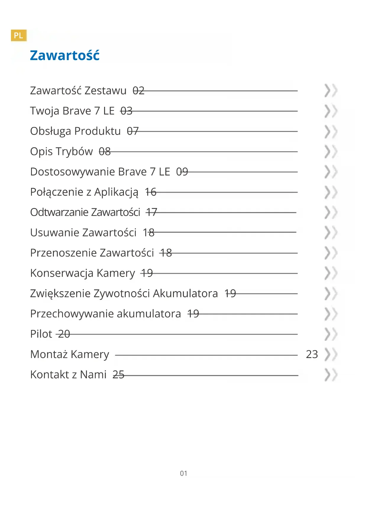25BRAVE 7 LE V1.8 KAMERA SPORTOWA INSTRUKCJA OBSŁUGIZawartość Zawartość Zestawu 02 Twoja Brave 7 LE 03 Obsługa Produktu 07 Opis Trybów 08 Dostosowywanie Brave 7 LE 09 Połączenie z Aplikacją 16 Odtwarzanie Zawartości 17 Usuwanie Zawartości 18 Przenoszenie Zawartości 18 Konserwacja Kamery 19 Zwiększenie Zywotności Akumulatora 19 Przechowywanie akumulatora 19 Pilot 20 Montaż Kamery 23 Kontakt z Nami 25