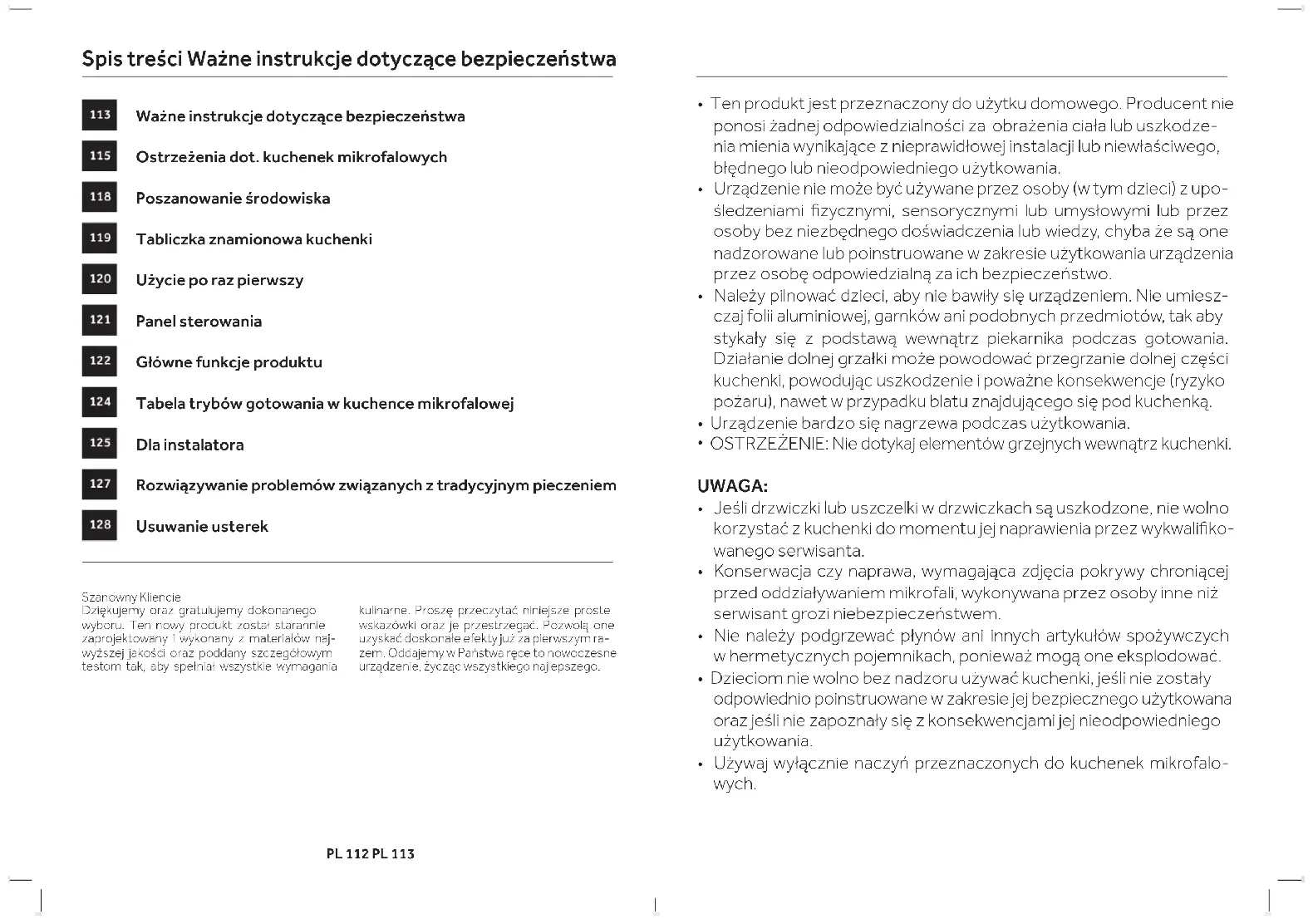 ERRORE FUMOPL 112 PL 113 Szanowny KliencieDziękujemy oraz gratulujemy dokonanego wyboru. Ten nowy produkt został starannie zaprojektowany i wykonany z materiałów naj-wyższej jakości oraz poddany szczegółowym testom tak, aby spełniał wszystkie wymagania kulinarne. Proszę przeczytać niniejsze proste wskazówki oraz je przestrzegać. Pozwolą one uzyskać doskonałe efekty już za pierwszym ra-zem. Oddajemy w Państwa ręce to nowoczesne urządzenie, życząc wszystkiego najlepszego. Ważne instrukcje dotyczące bezpieczeństwa Ostrzeżenia dot. kuchenek mikrofalowych Poszanowanie środowiska Tabliczka znamionowa kuchenki Użycie po raz pierwszy Panel sterowania Główne funkcje produktu Tabela trybów gotowania w kuchence mikrofalowej Dla instalatora Rozwiązywanie problemów związanych z tradycyjnym pieczeniem Usuwanie usterek