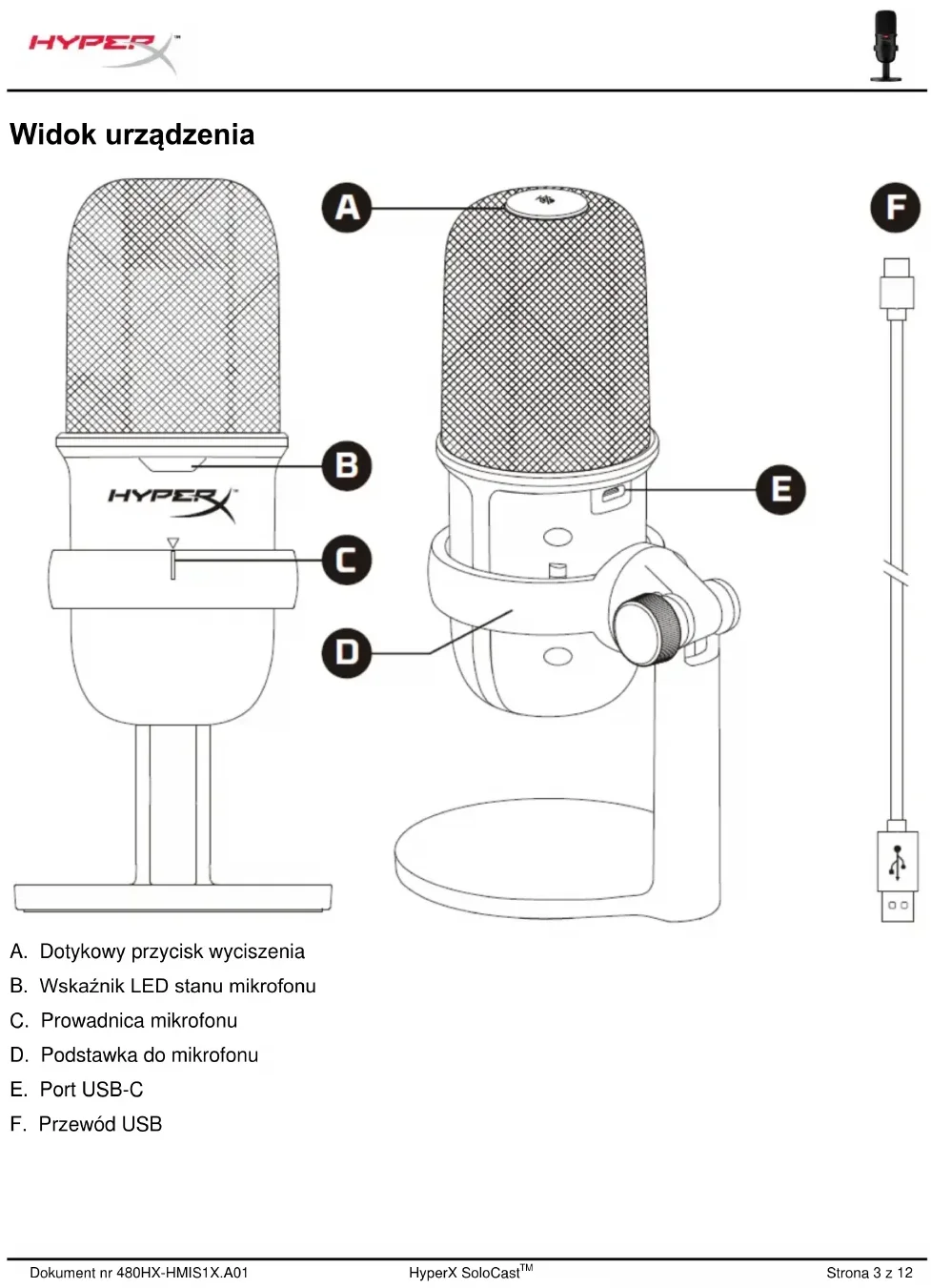 Widok urządzenia A. Dotykowy przycisk wyciszenia B. Wskaźnik LED stanu mikrofonu C. Prowadnica mikrofonu D. Podstawka do mikrofonu E. Port USB-C F. Przewód USBDokument nr 480HX-HMIS1X.A01 HyperX SoloCast