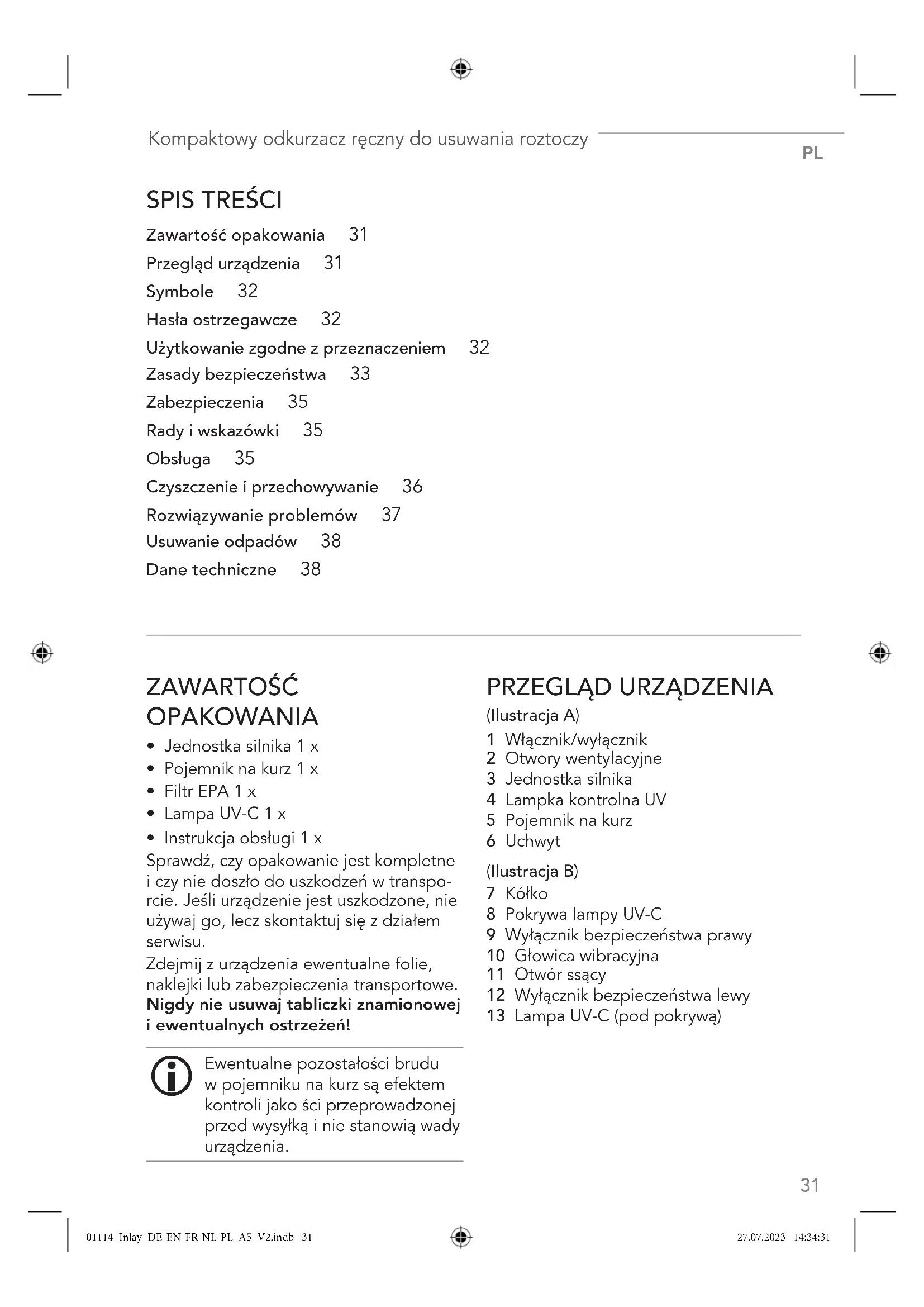 Zawartość opakowania 31 Przegląd urządzenia 31 Symbole 32 Hasła ostrzegawcze 32 Użytkowanie zgodne zprzeznaczeniem 32 Zasady bezpieczeństwa 33 Zabezpieczenia 35 Rady i wskazówki 35 Obsługa 35 Czyszczenie iprzechowywanie 36 Rozwiązywanie problemów 37 Usuwanie odpadów 38 Dane techniczne 38 01114_Inlay_DE-EN-FR-NL-PL_A5_V2.indb 3101114_Inlay_DE-EN-FR-NL-PL_A5_V2.indb 31 27.07.2023 14:34:3127.07.2023 14:34:31PL