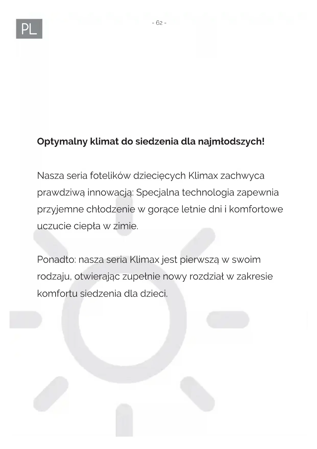 - Przed uzyciem fotelika daneciecego z technologiia Klimax prosimy o dokladne zapoznanie sie z instrukcja obstugi i przystrzeganie wszystkich informacji dotycznych bezpiecznych i uzytkowania.