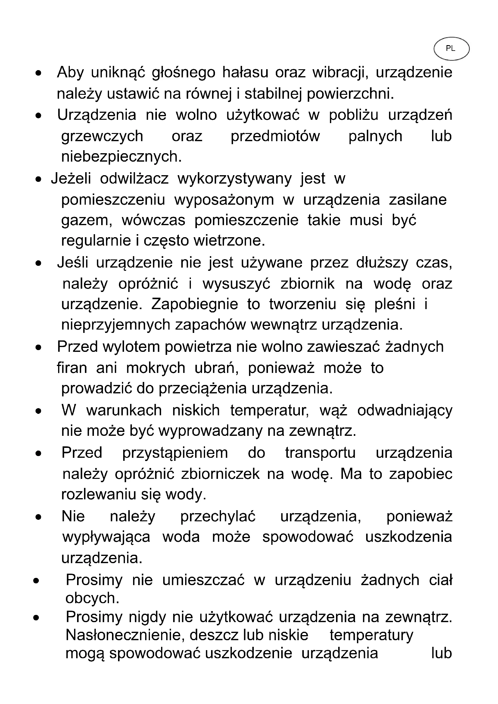 - Jeżeli odwilżacz wykorzystywany jest w pomieszczeniu wyposażonym w urządzenia zasilane gazem, wówczas pomieszczenie takie musi być regularnie i często wietrzone.