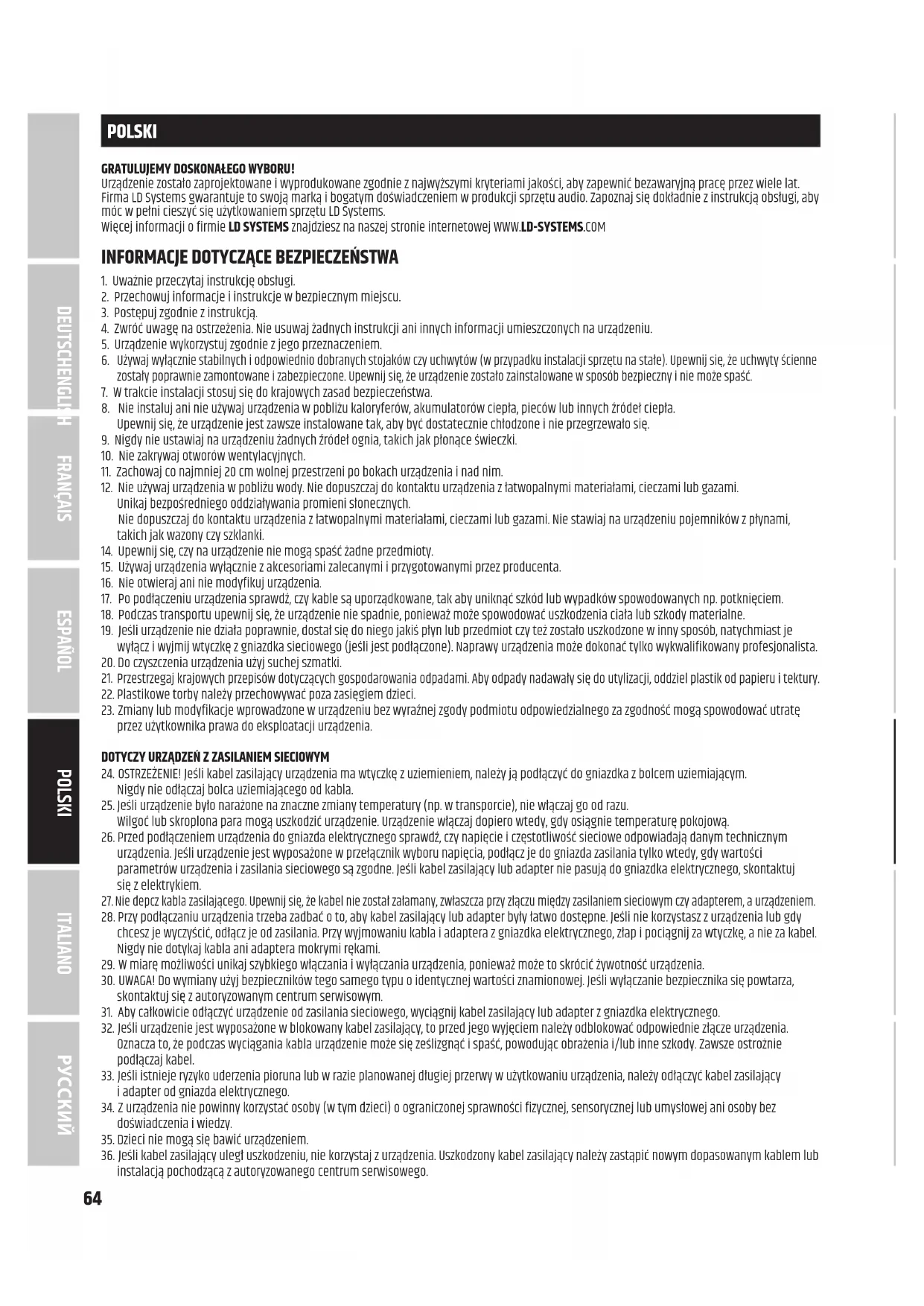 POLSKI64 POLSKI GRATULUJEMY DOSKONAŁEGO WYBORU! Urządzenie zostało zaprojektowane iwyprodukowane zgodnie znajwyższymi kryteriami jakości, aby zapewnić bezawaryjną pracę przez wiele lat. Firma LD Systems gwarantuje to swoją marką ibogatym doświadczeniem wprodukcji sprzętu audio. Zapoznaj się dokładnie zinstrukcją obsługi, aby móc w pełni cieszyć się użytkowaniem sprzętu LD Systems. Więcej informacji ofirmie LDSYSTEMS znajdziesz na naszej stronie internetowej WWW.LD-SYSTEMS.COM