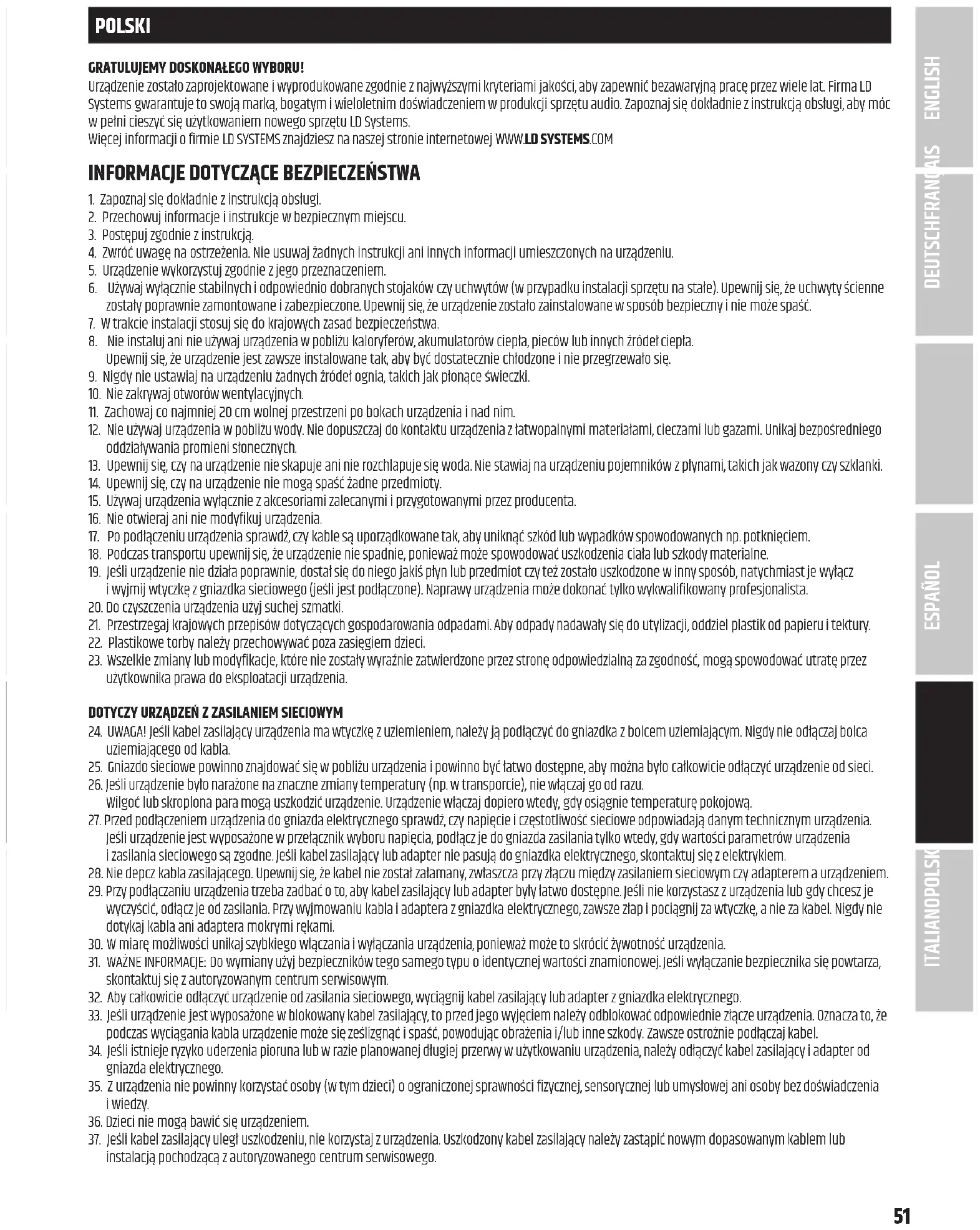 31. WAŻNE INFORMACJE: Do wymiany użyj bezpieczników tego samego typu oidentycznej wartości znamionowej. Jeśli wyłączanie bezpiecznika się powtarza, skontaktuj się zautoryzowanym centrum serwisowym. 32. Aby całkowicie odłączyć urządzenie od zasilania sieciowego, wyciągnij kabel zasilający lub adapter zgniazdka elektrycznego. 33. Jeśli urządzenie jest wyposażone wblokowany kabel zasilający, to przed jego wyjęciem należy odblokować odpowiednie złącze urządzenia. Oznacza to, że podczas wyciągania kabla urządzenie może się ześlizgnąć ispaść, powodując obrażenia i/lub inne szkody. Zawsze ostrożnie podłączaj kabel. 34. Jeśli istnieje ryzyko uderzenia pioruna lub wrazie planowanej długiej przerwy wużytkowaniu urządzenia, należy odłączyć kabel zasilający iadapter od gniazda elektrycznego. 35. Zurządzenia nie powinny korzystać osoby (wtym dzieci) oograniczonej sprawności fizycznej, sensorycznej lub umysłowej ani osoby bez doświadczenia iwiedzy.