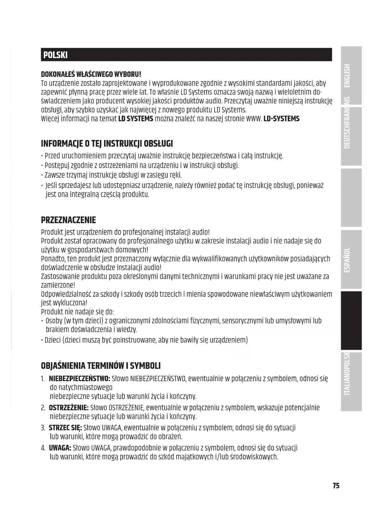 Las declaraciones de conformidad de los productos sujetos a la Directiva LVD, EMC y RoHS pueden solicitarse en info@adamhall.com. La declaración de conformidad de los productos sujetos a la Directiva DER puede descargarse de www.adamhall.com/compliance/. DECLARACIÓN DE CONFORMIDAD DE LA UE Adam Hall GmbH declara por la presente que este tipo de equipo de radio cumple con la Directiva 2014/53/UE. El texto completo de la declaración de conformidad de la UE está disponible en Dirección de Internet: www.adamhall.com/compliance/ Se reservan las erratas y los errores, así como los cambios técnicos o de otro tipo. ITALIANO POLSKI ESPAÑOL FRANCAIS DEUTSCHENGLISH75 POLSKI DOKONAŁEŚ WŁAŚCIWEGO WYBORU! To urządzenie zostało zaprojektowane i wyprodukowane zgodnie z wysokimi standardami jakości, aby zapewnić płynną pracę przez wiele lat. To właśnie LD Systems oznacza swoją nazwą i wieloletnim do- świadczeniem jako producent wysokiej jakości produktów audio. Przeczytaj uważnie niniejszą instrukcję obsługi, aby szybko uzyskać jak najwięcej z nowego produktu LD Systems. Więcej informacji na temat LD SYSTEMS można znaleźć na naszej stronie WWW. LD-SYSTEMS