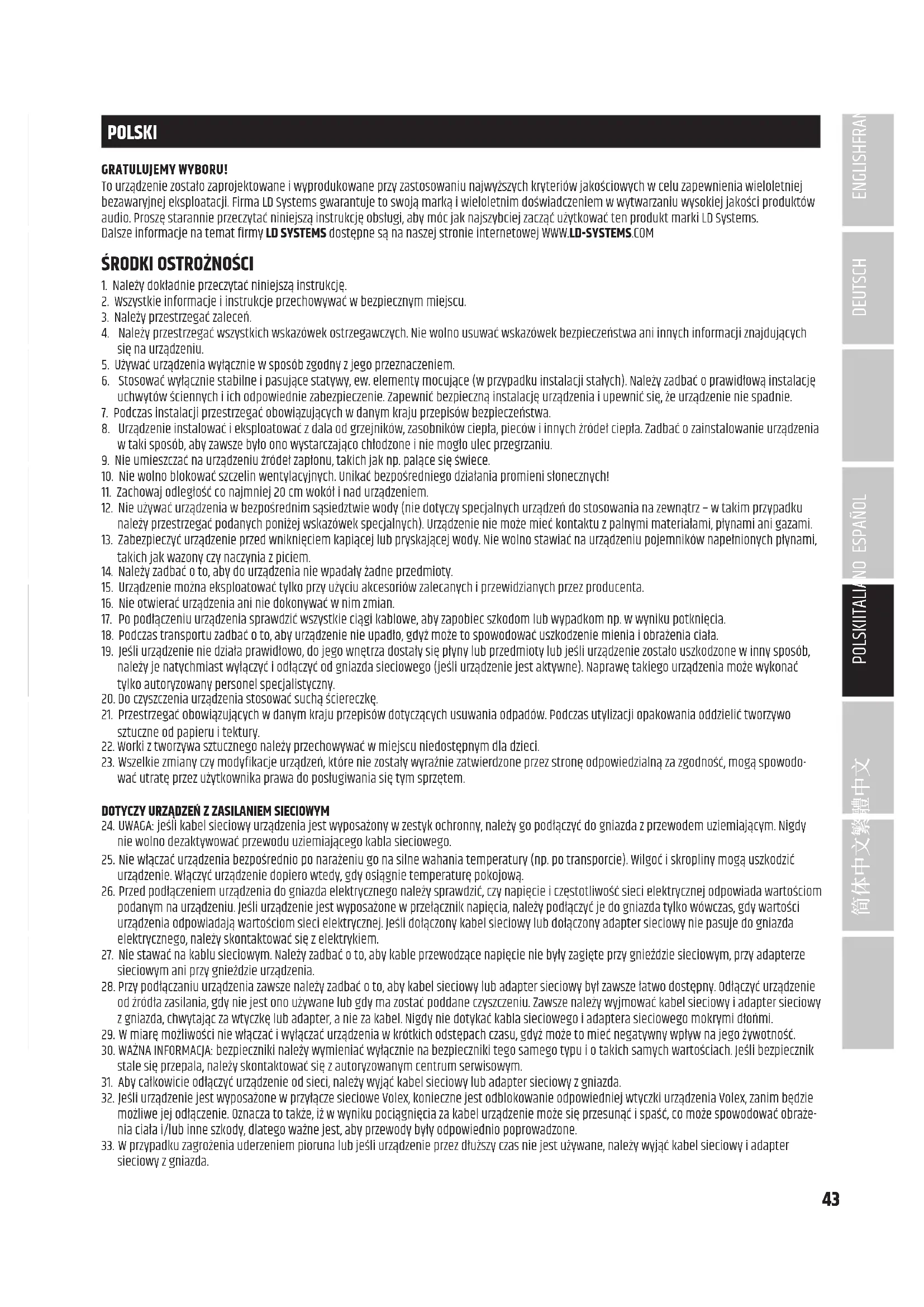 POLSKI GRATULUJEMY WYBORU! To urządzenie zostało zaprojektowane i wyprodukowane przy zastosowaniu najwyższych kryteriów jakościowych w celu zapewnienia wieloletniej bezawaryjnej eksploatacji. Firma LD Systems gwarantuje to swoją marką i wieloletnim doświadczeniem w wytwarzaniu wysokiej jakości produktów audio. Proszę starannie przeczytać niniejszą instrukcję obsługi, aby móc jak najszybciej zacząć użytkować ten produkt marki LD Systems. Dalsze informacje na temat firmy LD SYSTEMS dostępne są na naszej stronie internetowej WWW.LD-SYSTEMS.COM