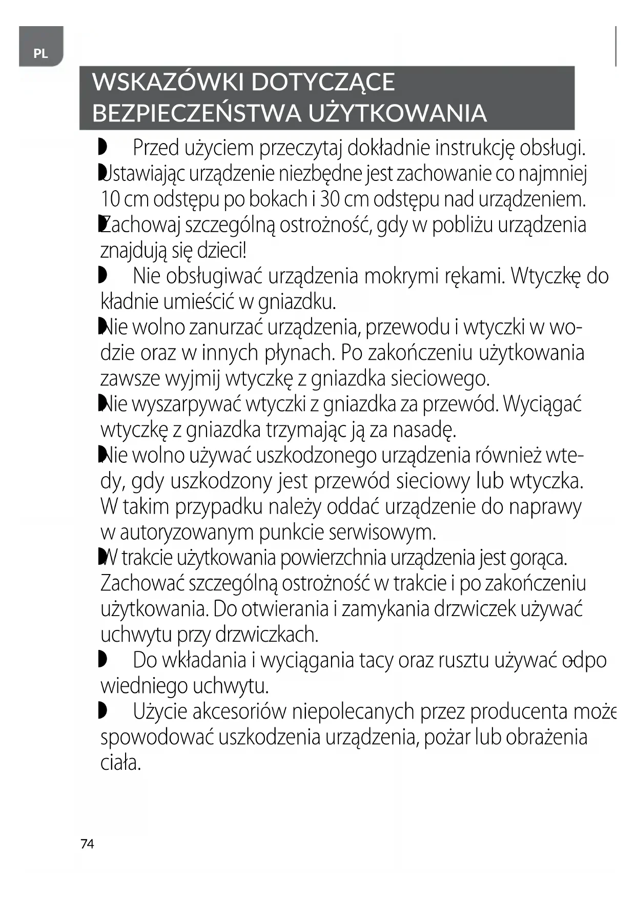 Używaj urządzenia wyłącznie do gotowania ipodgrzewania posiłku. Nie używaj urządzenia do niezamierzonych celów (ogrzewanie pomieszczenia, do celów komercyjnych itp.). Przed wymianą lampy wurządzeniu upewnij się, że urządze- nie jest odłączone, aby uniknąć ryzyka porażenia prądem.