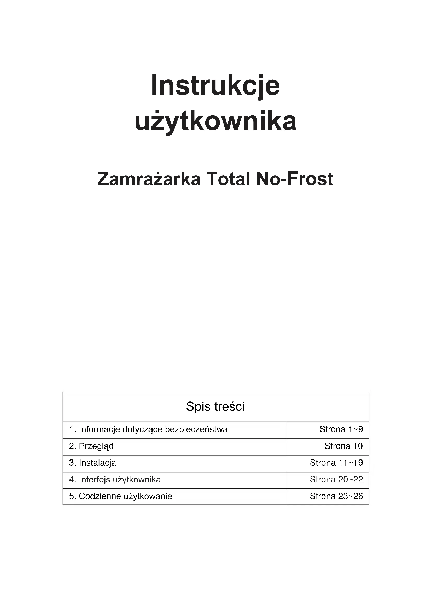Strona 23~261 Dziękujemy za zakup tego urządzenia. Przed rozpoczęciem użytkowania lodówki prosimy uważnie przeczytać tę instrukcję obsługi — zawarte w niej informacje pozwolą zmaksymalizować wydajność urządzenia. Całą dokumentację należy zachować w celu skorzystania z niej w przyszłości lub przekazania kolejnym właścicielom urządzenia. Urządzenie jest przeznaczone wyłącznie do użytku domowego lub podobnych zastosowań, takich jak: - kuchnie dla personelu w sklepach, biurach i innych miejscach pracy - w gospodarstwach rolnych, przez klientów hoteli, moteli oraz w innych środowiskach typu mieszkalnego - pensjonatach - w cateringu i podobnych branżach, nie w sprzedaży detalicznej. Urządzenie może być używane wyłącznie do przechowywania żywności. Każdy inny sposób użytkowania jest uznawany za niebezpieczny i producent nie ponosi odpowiedzialności za jego skutki. Zalecane jest zapoznanie się z warunkami gwarancji.