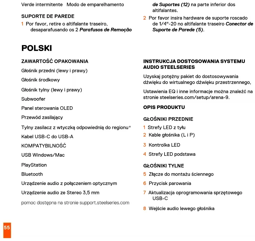 1 Por favor, retire o altifalante traseiro, desaparafusando os 2 Parafusos de Remoção de Suportes (12) na parte inferior dos altifalantes. 2 Por favor insira hardware de suporte roscado de 1/4"-20 no altifalante traseiro Conector de Suporte de Parede (5). POLSKI ZAWARTOŚĆ OPAKOWANIA Głośnik przedni (lewy i prawy) Głośnik środkowy Głośnik tylny (lewy i prawy) Subwoofer Panel sterowania OLED Przewód zasilający Tylny zasilacz zwtyczką odpowiednią do regionu* Kabel USB-C do USB-A KOMPATYBILNOŚĆ USB Windows/Mac PlayStation Bluetooth Urządzenie audio z połączeniem optycznym Urządzenie audio ze Stereo 3,5 mm pomoc dostępna na stronie support.steelseries.com