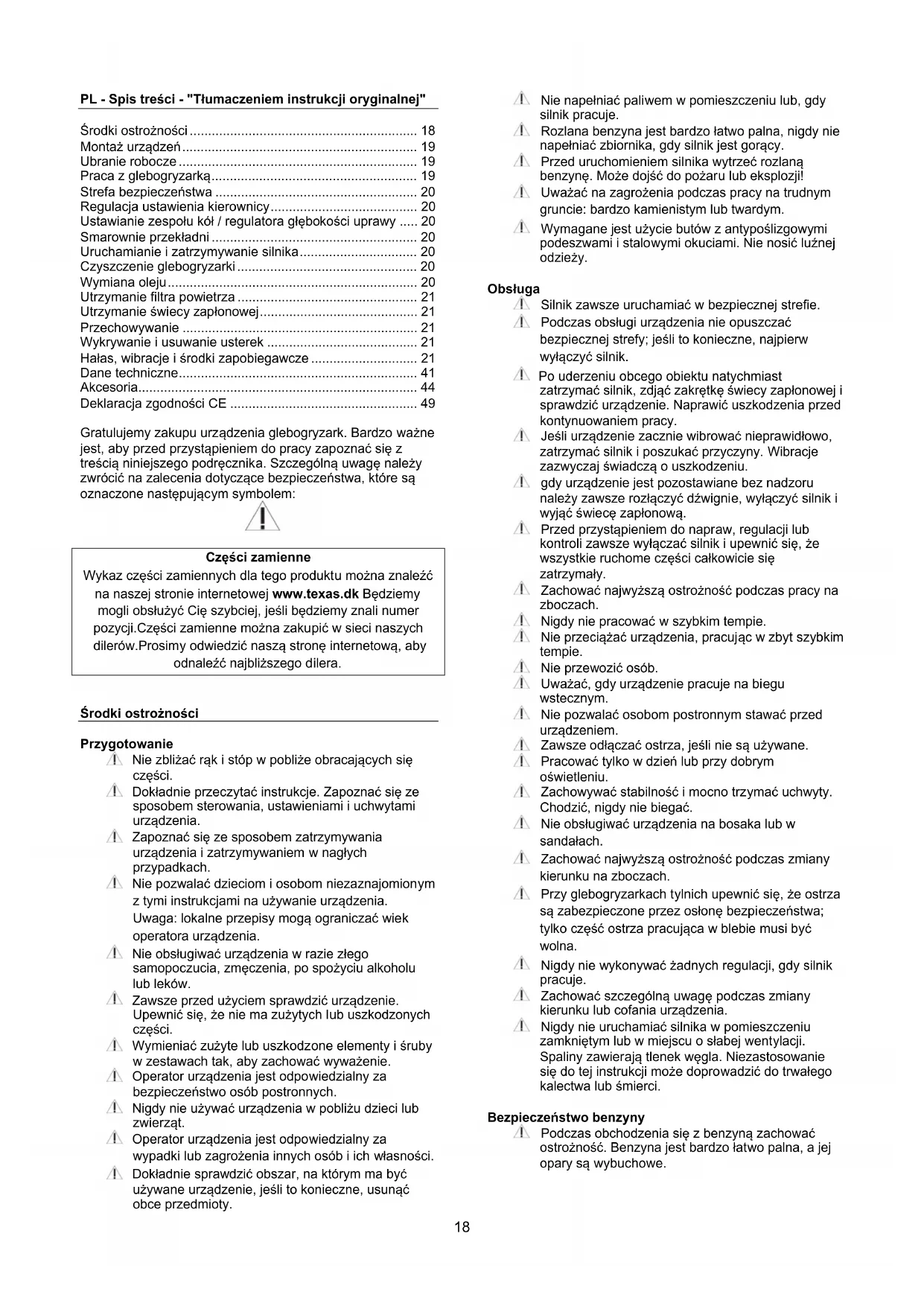 - Deklaracja zgodności CE Gratulujemy zakupu urządzenia glebogryzark. Bardzo ważne jest, aby przed przystąpieniem do pracy zapoznać się z treścią niniejszego podręcznika. Szczególną uwagę należy zwrócić na zalecenia dotyczące bezpieczeństwa, które są oznaczone następującym symbolem: p. 49
